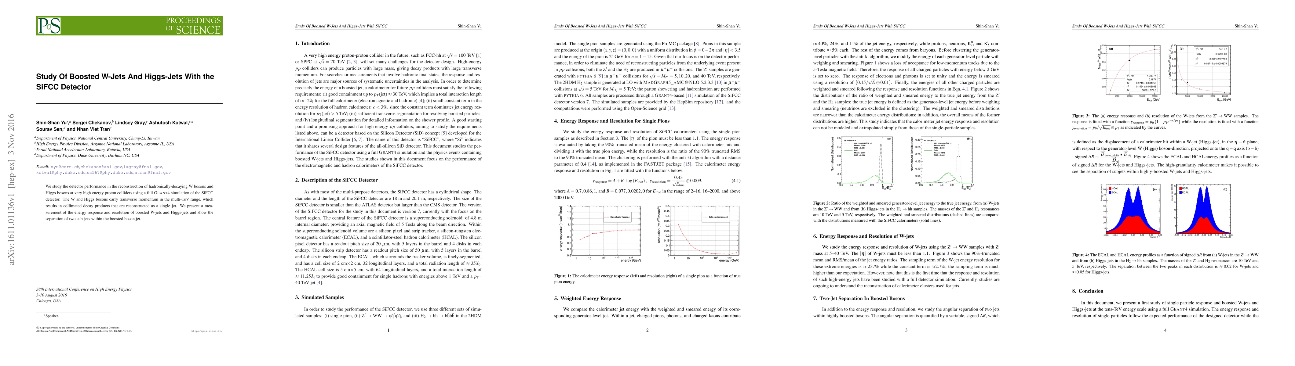 This study evaluates the SiFCC detector's performance in reconstructing high-energy W-jets and Higgs-jets through GEANT4 simulations. The research measures the energy response and resolution for these jets and demonstrates the ability to distinguish sub-jets within the boosted boson jets.