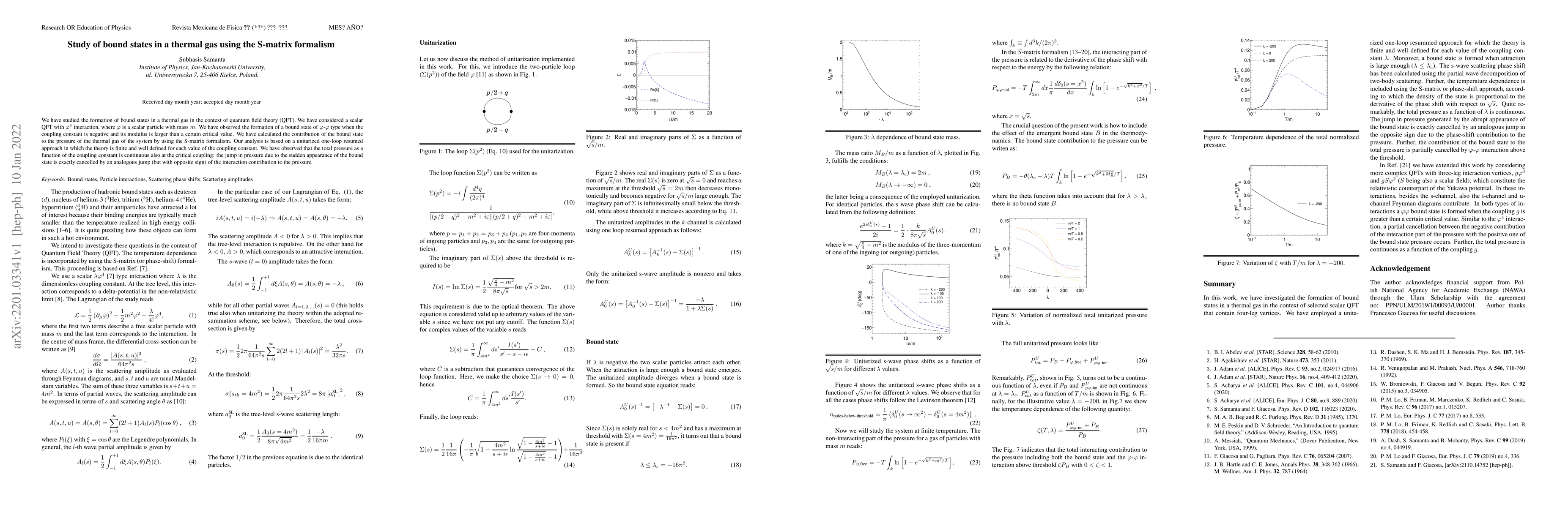 We have studied the formation of bound states in a thermal gas in the context of quantum field theory (QFT). We have considered a scalar QFT with $\varphi^4$ interaction, where $\varphi$ is a scalar particle with mass $m$. We have observed the formation of a bound state of $\varphi$-$\varphi$ type when the coupling constant is negative and its modulus is larger than a certain critical value. We have calculated the contribution of the bound state to the pressure of the thermal gas of the system by using the S-matrix formalism. Our analysis is based on a unitarized one-loop resumed approach in which the theory is finite and well defined for each value of the coupling constant. We have observed that the total pressure as a function of the coupling constant is continuous also at the critical coupling: the jump in pressure due to the sudden appearance of the bound state is exactly cancelled by an analogous jump (but with opposite sign) of the interaction contribution to the pressure.