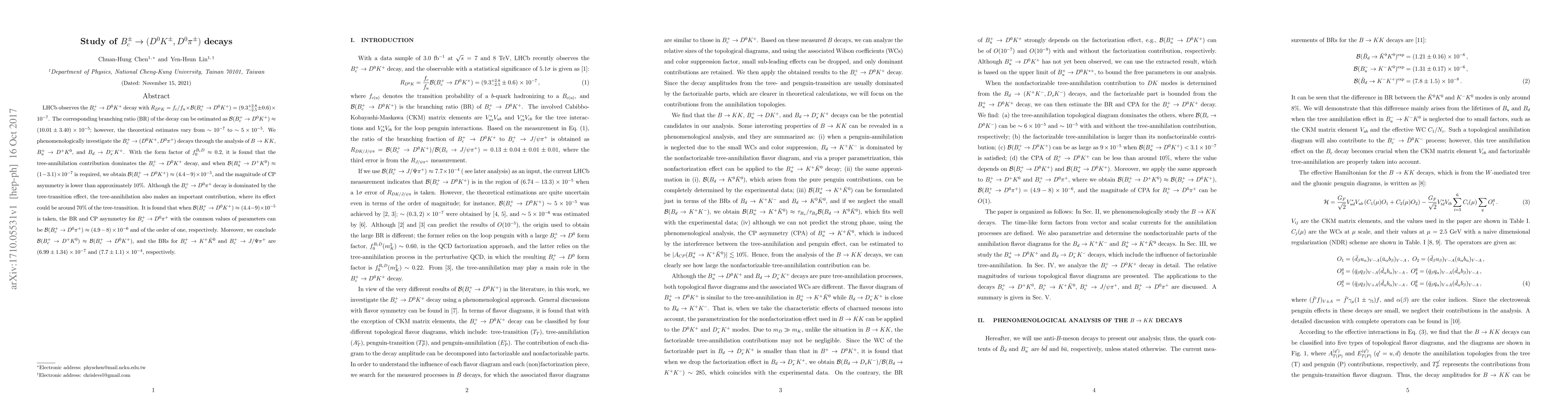 LHCb observes the $B^+_c \to D^0 K^+$ decay with $R_{D^0 K} = f_c/f_u \times {\cal B}(B^+_c \to D^0 K^+)=(9.3^{+2.8}_{-2.5} \pm 0.6)\times 10^{-7}$. The corresponding branching ratio (BR) of the decay can be estimated as ${\cal B}(B^+_c \to D^0 K^+) \approx (10.01 \pm 3.40)\times 10^{-5}$; however, the theoretical estimates vary from $\sim 10^{-7}$ to $\sim 5\times 10^{-5}$. We phenomenologically investigate the $B^+_c \to (D^0 K^+, D^0 \pi^+)$ decays through the analysis of $B\to KK$, $B^+_u\to D^+ K^0$, and $B_d \to D^-_s K^+$. With the form factor of $f^{B_c D}_0\approx 0.2$, it is found that the tree-annihilation contribution dominates the $B^+_c \to D^0 K^+$ decay, and when ${\cal B}(B^+_u \to D^+ K^0) \approx (1-3.1) \times 10^{-7}$ is required, we obtain ${\cal B}(B^+_c \to D^0 K^+)\approx (4.4- 9) \times 10^{-5}$, and the magnitude of CP asymmetry is lower than approximately $10\%$. Although the $B^+_c \to D^0 \pi^+$ decay is dominated by the tree-transition effect, the tree-annihilation also makes an important contribution, where its effect could be around $70\%$ of the tree-transition. It is found that when ${\cal B}(B^+_c \to D^0 K^+)\approx (4.4- 9) \times 10^{-5}$ is taken, the BR and CP asymmetry for $B^+_c \to D^0 \pi^+$ with the common values of parameters can be ${\cal B}(B^+_c \to D^0 \pi^+)\approx (4.9-8)\times 10^{-6}$ and of the order of one, respectively. Moreover, we conclude ${\cal B}(B^+_c \to D^+ K^0)\approx {\cal B}(B^+_c \to D^0 K^+)$, and the BRs for $B^+_c \to K^+ \bar K^0$ and $B^+_c \to J/\Psi \pi^+$ are $(6.99 \pm 1.34) \times 10^{-7}$ and $(7.7 \pm 1.1)\times 10^{-4}$, respectively.