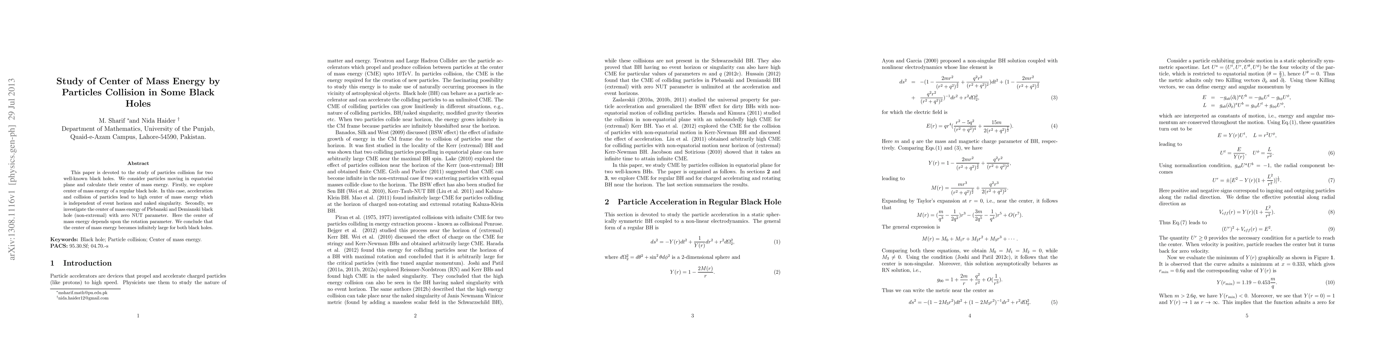 This research calculates center of mass energy from particle collisions in two black holes. For a regular black hole, the energy is high and horizon/singularity independent. In Plebanski-Demianski black holes, energy depends on rotation, becoming infinitely large in both cases.