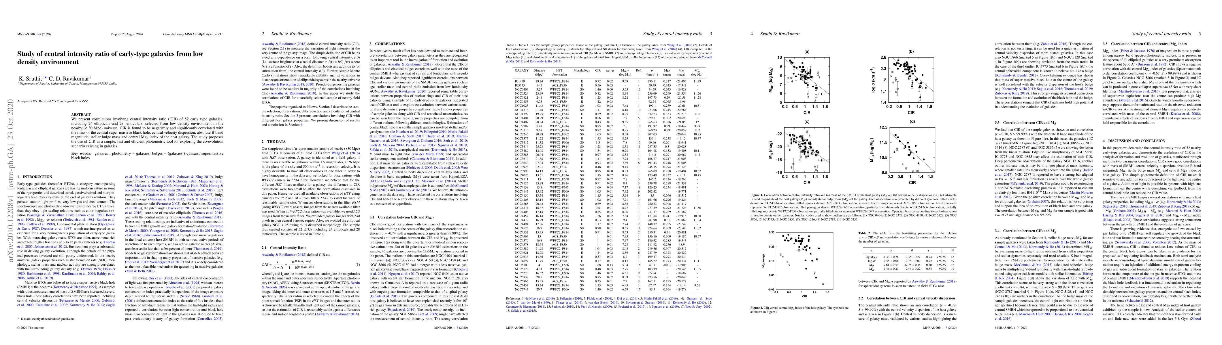 Summary: This study investigates the central intensity ratio (CIR) of 52 early-type galaxies in low-density environments, revealing significant negative correlations with several galaxy properties, including the mass of the central supermassive black hole and stellar bulge mass. The findings suggest CIR as a useful tool for studying co-evolution in galaxies.