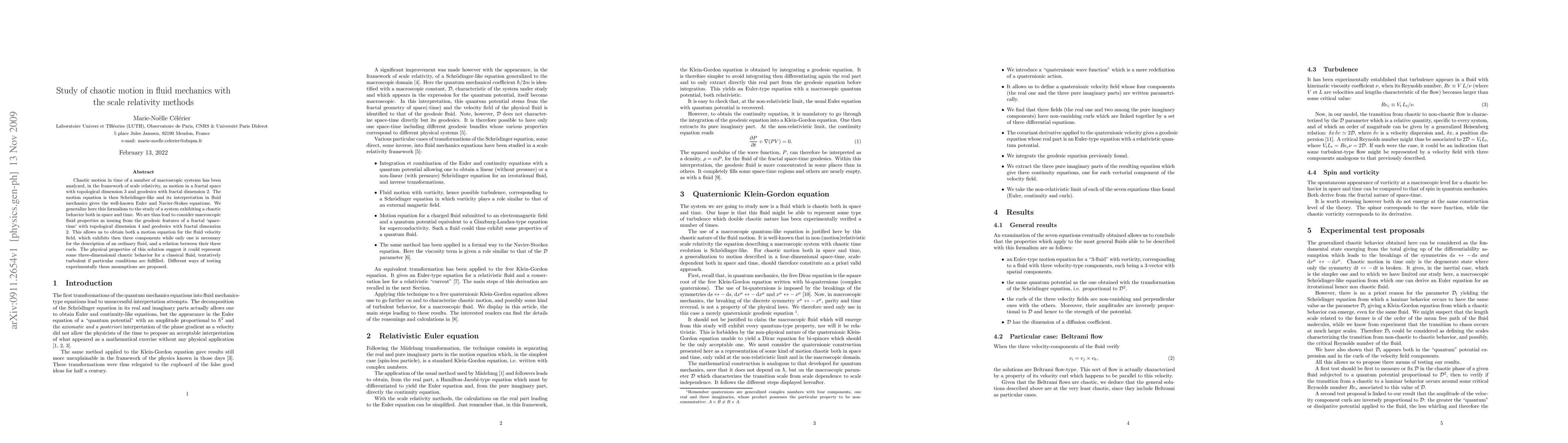 This paper explores chaotic motion in fluid mechanics using scale relativity, proposing a fractal space-time model with a topological dimension of 4 and fractal geodesic dimension of 2. It derives a Schrödinger-like equation that generalizes to describe three-dimensional chaotic fluid behavior, potentially representing turbulence under specific conditions, with experimental testing methods suggested.