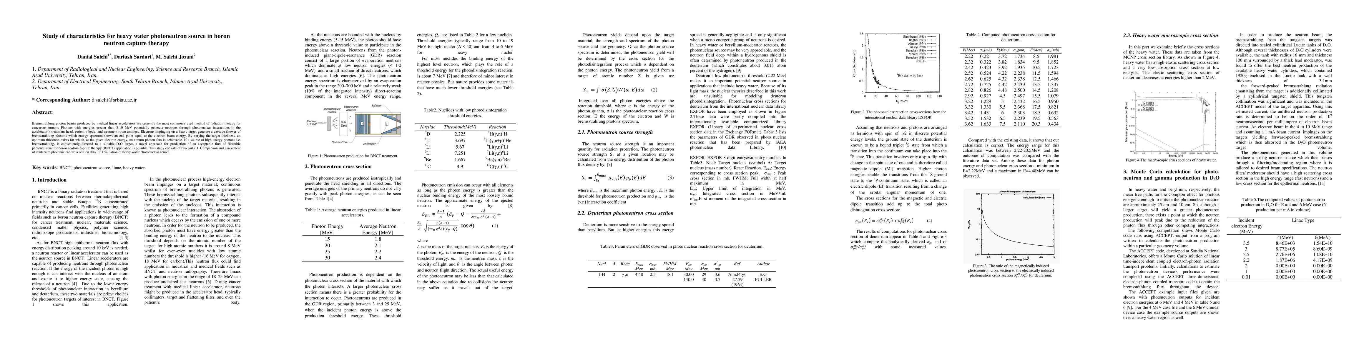 Bremsstrahlung photon beams produced by medical linear accelerators are currently the most commonly used method of radiation therapy for cancerous tumors. Photons with energies greater than 8-10 MeV potentially generate neutrons through photonuclear interactions in the accelerator's treatment head, patient's body, and treatment room ambient. Electrons impinging on a heavy target generate a cascade shower of bremsstrahlung photons, the energy spectrum of which shows an end point equal to the electron beam energy. By varying the target thickness, an optimum thickness exists for which, at the given electron energy, maximum photon flux is achievable. If a source of high-energy photons i.e. bremsstrahlung, is conveniently directed to a suitable D2O target, a novel approach for production of an acceptable flux of filterable photoneturons for boron neutron capture therapy (BNCT) application is possible. This study consists of two parts. 1. Comparison and assessment of deuterium photonuclear cross section data. 2. Evaluation of the heavy water photonuclear source.