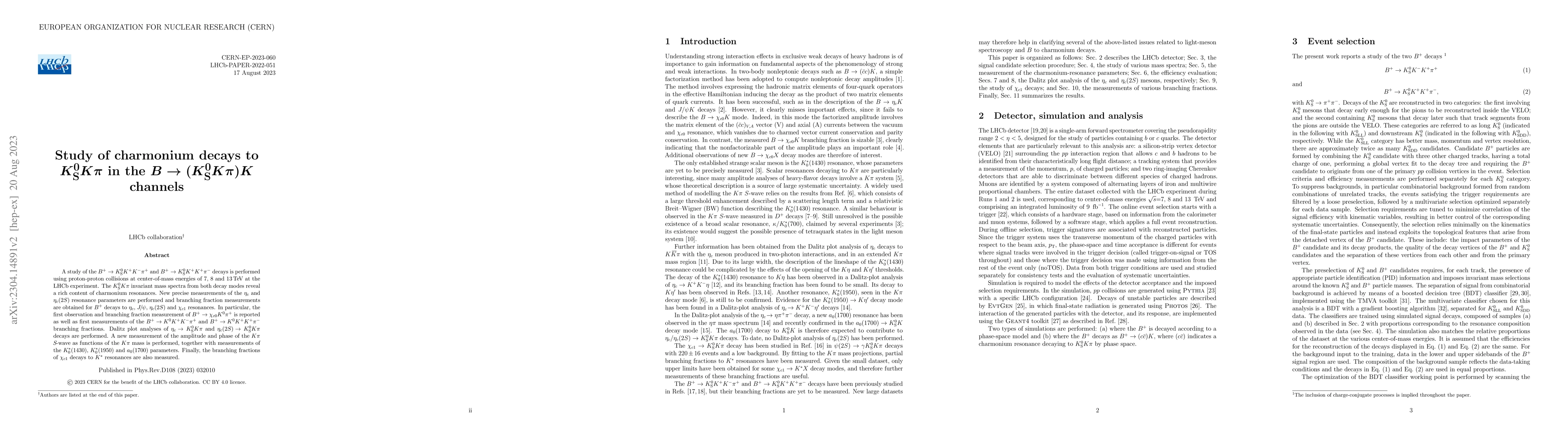 A study of the $B^+\to K^0_SK^+K^-\pi^+$ and $B^+\to K^0_SK^+K^+\pi^-$ decays is performed using proton-proton collisions at center-of-mass energies of 7, 8 and 13 TeV at the LHCb experiment. The $K^0_SK \pi$ invariant mass spectra from both decay modes reveal a rich content of charmonium resonances. New precise measurements of the $\eta_c$ and $\eta_c(2S)$ resonance parameters are performed and branching fraction measurements are obtained for $B^+$ decays to $\eta_c$, $J/\psi$, $\eta_c(2S)$ and $\chi_{c1}$ resonances. In particular, the first observation and branching fraction measurement of $B^+ \to \chi_{c0} K^0 \pi^+$ is reported as well as first measurements of the $B^+\to K^0K^+K^-\pi^+$ and $B^+\to K^0K^+K^+\pi^-$ branching fractions. Dalitz plot analyses of $\eta_c \to K^0_SK\pi$ and $\eta_c(2S) \to K^0_SK\pi$ decays are performed. A new measurement of the amplitude and phase of the $K \pi$ $S$-wave as functions of the $K \pi$ mass is performed, together with measurements of the $K^*_0(1430)$, $K^*_0(1950)$ and $a_0(1700)$ parameters. Finally, the branching fractions of $\chi_{c1}$ decays to $K^*$ resonances are also measured.