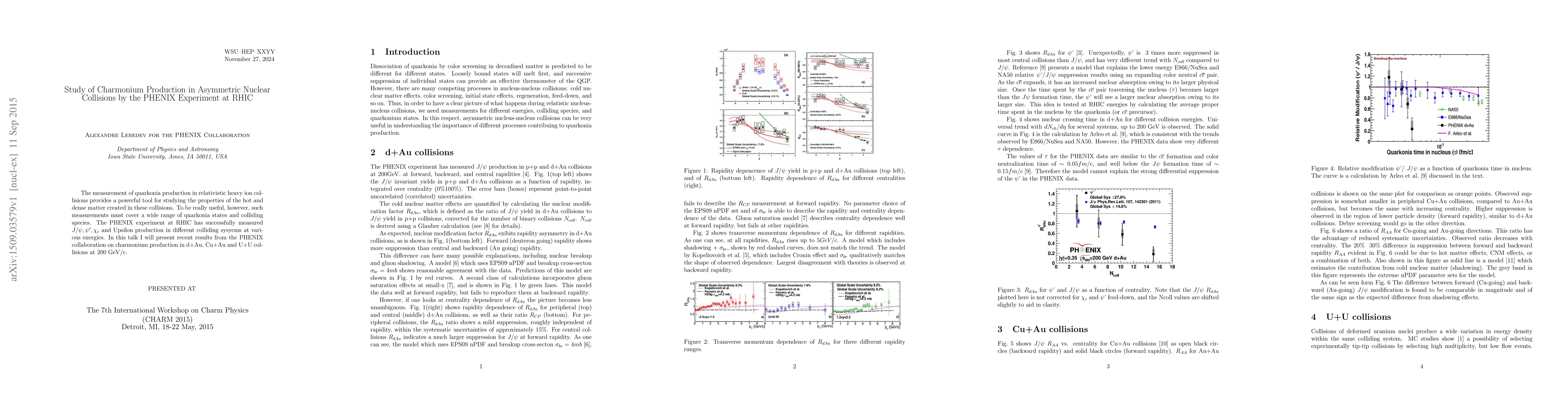 The PHENIX experiment at RHIC has measured charmonium production in various asymmetric nuclear collisions, providing insights into the properties of hot and dense matter. Recent results include J/psi, psi-prime, chi_c, and Upsilon production in d+Au, Cu+Au, and U+U collisions at 200 GeV/c.