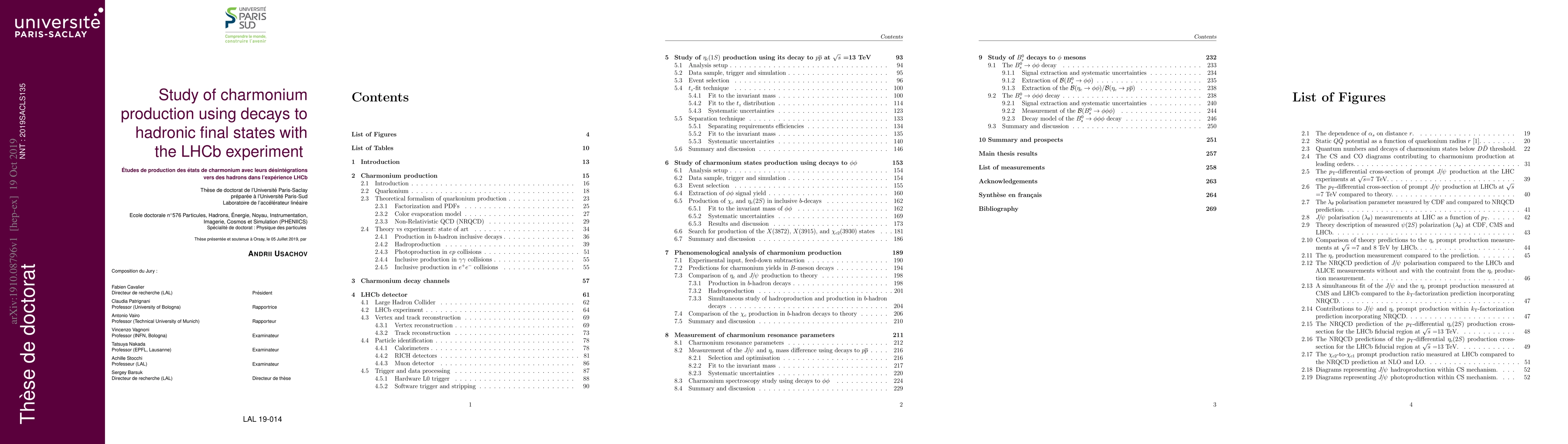 Studies of charmonium properties and production mechanism started with the discovery of $J/\psi$ meson. Since more than 40 years the charmonium production mechanism is still not entirely understood. Following the era of investigations at $e^+e^-$ machines, nowadays, charmonium states are copiously produced at hadron colliders, that allows systematic studies of their resonance parameters, production observables and decays. Despite large production rates, many charmonium states are barely studied due to the complications of their reconstruction against a large background level. The LHCb experiment provides a unique opportunity to study S-wave and P-wave charmonium states using their decays to hadrons. This allows measuring production observables of $\eta_c$ and $\chi_c$ charmonium states. According to the theoretical formalism of Non-Relativistic QCD (NRQCD), the production observables of the same wave charmonium states are linked. Hence, the LHCb measurements provide a series of stringent tests of NRQCD. In the framework of this thesis, the first measurement of the $\eta_c(1S)$ differential production cross-section at $\sqrt{s}=13\,TeV$ and the most precise to date single mass measurement are performed, where the $\eta_c(1S)$ state is reconstructed via its decay to $p\bar{p}$. In addition, the production of the $\chi_c$ and $\eta_c(2S)$ states in $b$-hadron decays is studied using decays to $\phi\phi$. The obtained results are confronted with existing theory predictions. The original phenomenological analysis concludes that the description of charmonium prompt production and production in inclusive $b$-hadron decays in an entire range of transverse momentum remains a challenge.