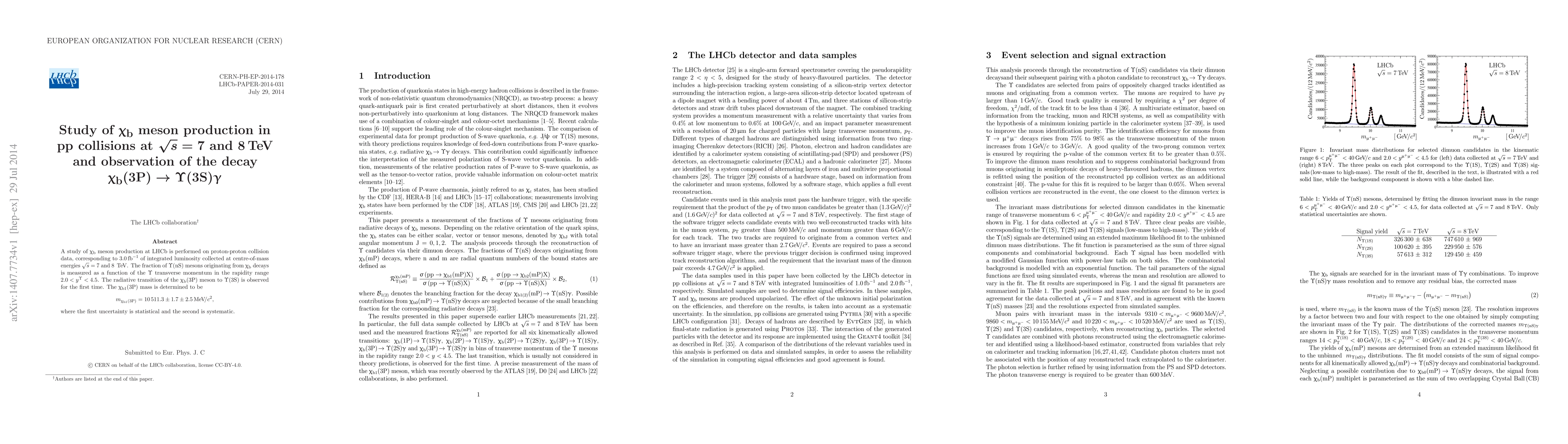 A study of $\chi_{b}$ meson production at LHCb is performed on proton-proton collision data, corresponding to 3.0fb$^{-1}$ of integrated luminosity collected at centre-of-mass energies $\sqrt{s}=7$ and 8TeV. The fraction of $\Upsilon(nS)$ mesons originating from $\chi_{b}$ decays is measured as a function of the $\Upsilon$ transverse momentum in the rapidity range $2.0 < y^{\Upsilon} < 4.5$. The radiative transition of the $\chi_{b}(3P)$ meson to $\Upsilon(3S)$ is observed for the first time. The $\chi_{b1}(3P)$ mass is determined to be $$m(\chi_{b1}(3P)) = 10\,511.3 \pm 1.7 \pm 2.5 MeV/c^2,$$ where the first uncertainty is statistical and the second is systematic.