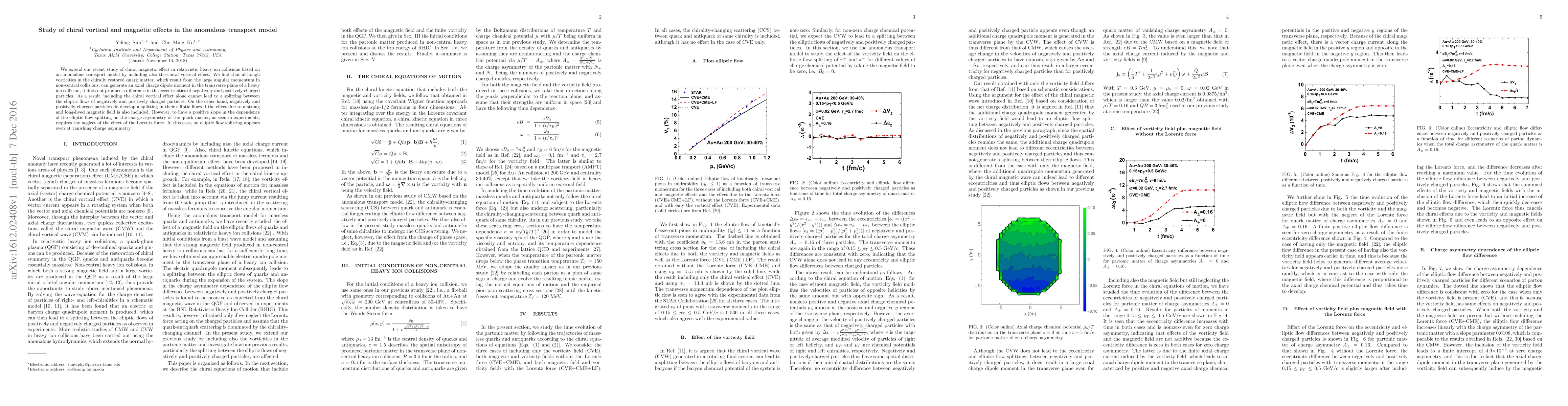 We extend our recent study of chiral magnetic effect in relativistic heavy ion collisions based on an anomalous transport model by including also the chiral vortical effect. We find that although vorticities in the chirally restored quark matter, which result from the large angular momentum in non-central collisions, can generate an axial charge dipole moment in the transverse plane of a heavy ion collision, it does not produce a difference in the eccentricities of negatively and positively charged particles. As a result, including the chiral vortical effect alone cannot lead to a splitting between the elliptic flows of negatively and positively charged particles. On the other hand, negatively and positively charged particles do develop a splitting in their elliptic flows if the effect due to a strong and long-lived magnetic field is also included. However, to have a positive slope in the dependence of the elliptic flow splitting on the charge asymmetry of the quark matter, as seen in experiments, requires the neglect of the effect of the Lorentz force. In this case, an elliptic flow splitting appears even at vanishing charge asymmetry.