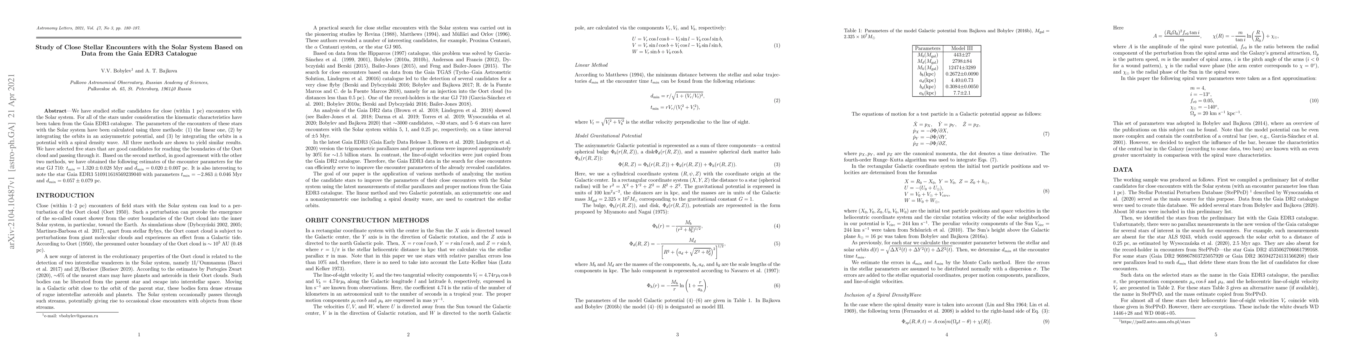 Researchers studied stellar encounters with our solar system using Gaia EDR3 catalogue data, finding that five stars may reach the Oort cloud boundaries.