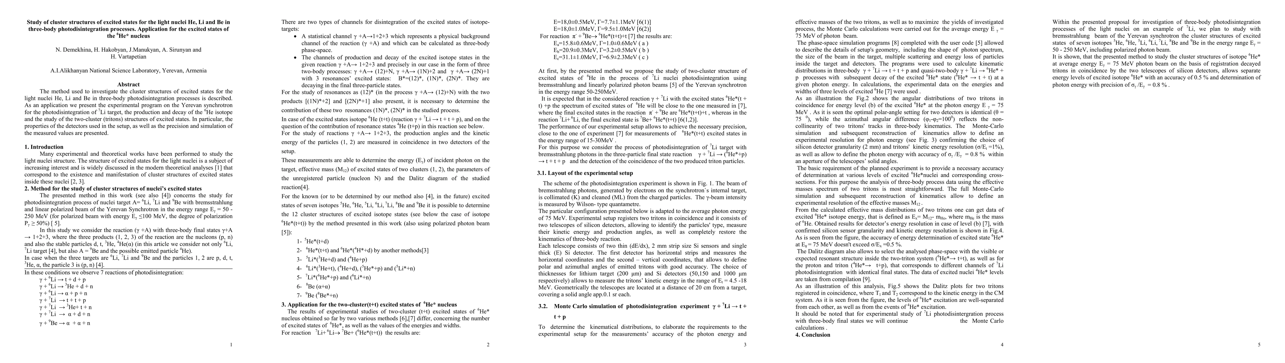 This paper investigates the cluster structures of excited states in light nuclei He, Li, and Be via three-body photodisintegration processes, with a focus on the 6He* nucleus. The study employs experimental methods at the Yerevan synchrotron, detailing the setup and precision of detectors used to analyze the photodisintegration of 7Li and the 6He isotope.