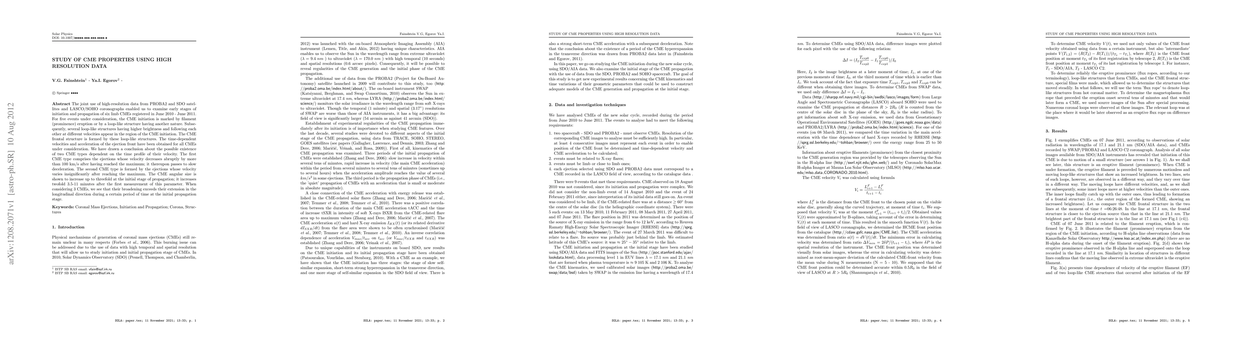 The joint use of high-resolution data from PROBA2 and SDO satellites and LASCO/SOHO coronographs enabled us to examine early stages of initiation and propagation of six limb CMEs registered in June 2010 - June 2011. For five events under consideration, the CME initiation is marked by filament (prominence) eruption or by a loop-like structure having another nature. Subsequently, several loop-like structures having higher brightness and following each other at different velocities appear in the region of the CME initiation. The CME frontal structure is formed by these loop-like structures. The time-dependent velocities and acceleration of the ejection front have been obtained for all CMEs under consideration. We have drawn a conclusion about the possible existence of two CME types dependent on the time profile of their velocity. The first CME type comprises the ejections whose velocity decreases abruptly by more than 100 km/s after having reached the maximum; it thereupon passes to slow deceleration/variation. The second CME type is formed by the ejections whose velocity varies insignificantly after reaching the maximum. The CME angular size is shown to increase up to threefold at the initial stage of propagation; it increases twofold 3.5-11 minutes after the first measurement of this parameter. When considering 3 CMEs, we see that their broadening exceeds their extension in the longitudinal direction during a certain period of time at the initial propagation stage.