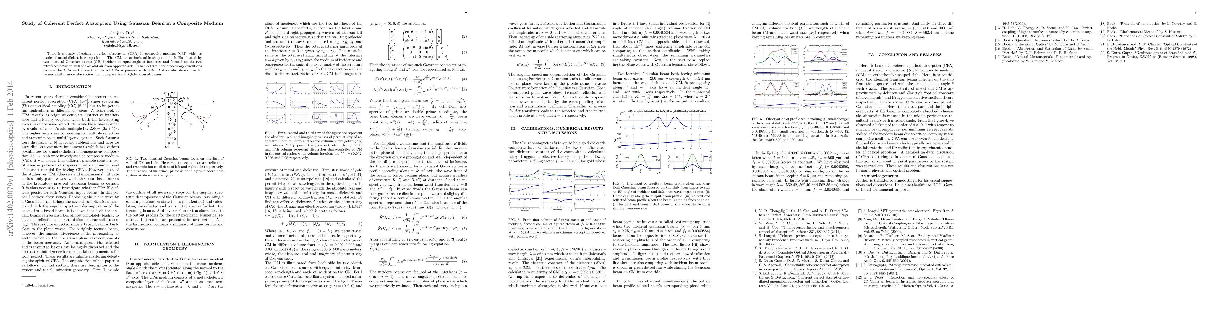 This study investigates coherent perfect absorption (CPA) in a metal-dielectric composite medium illuminated by Gaussian beams. It determines the conditions for CPA and demonstrates that broader beams achieve higher absorption compared to tightly focused beams.