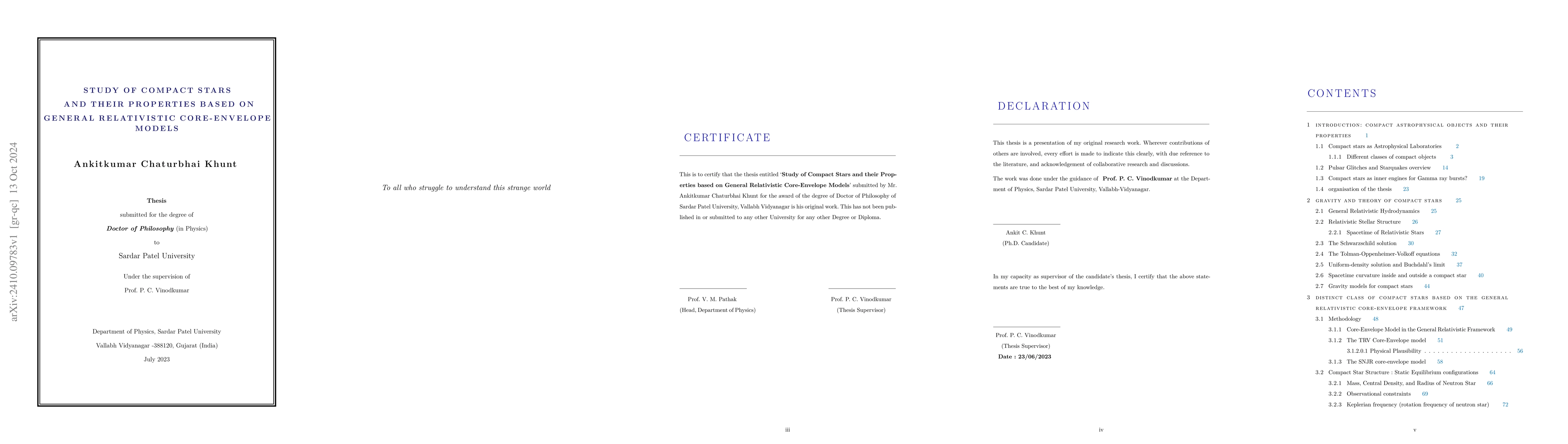 This thesis explores compact objects, particularly neutron stars, focusing on their properties, classification, and stability within the framework of general relativity. Two distinct studies are presented. The first study examines the properties of compact stars, including neutron stars, using an equation of state from a core-envelope model. By solving Einstein's equations with pseudo-spheroidal and spherically symmetric geometries, the mass-radius relationship is derived, leading to the classification of compact stars into three categories: highly compact self-bound stars (radii $<$ 9 km), normal neutron stars (radii 9--12 km), and soft matter neutron stars (radii 12--20 km). Other parameters such as Keplerian frequency, surface gravity, and gravitational redshift are also computed, offering insights into highly compact neutron stars with exotic compositions. The second study investigates the impact of density perturbations and local anisotropy on stellar stability. Using the cracking concept and a core-envelope model with anisotropic pressure in the envelope, we explore the potential of these configurations as progenitors for starquakes. The buildup of strain energy in the envelope, linked to anisotropy, can reach up to $10^{50}$ erg -- comparable to energy released in giant gamma-ray bursts. This study thus contributes to understanding the relationship between starquakes and gamma-ray bursts. Overall, this work advances the understanding of neutron stars by classifying them based on their radii and investigating the stability of their matter structures, providing new insights into starquakes and their possible connections with gamma-ray bursts.