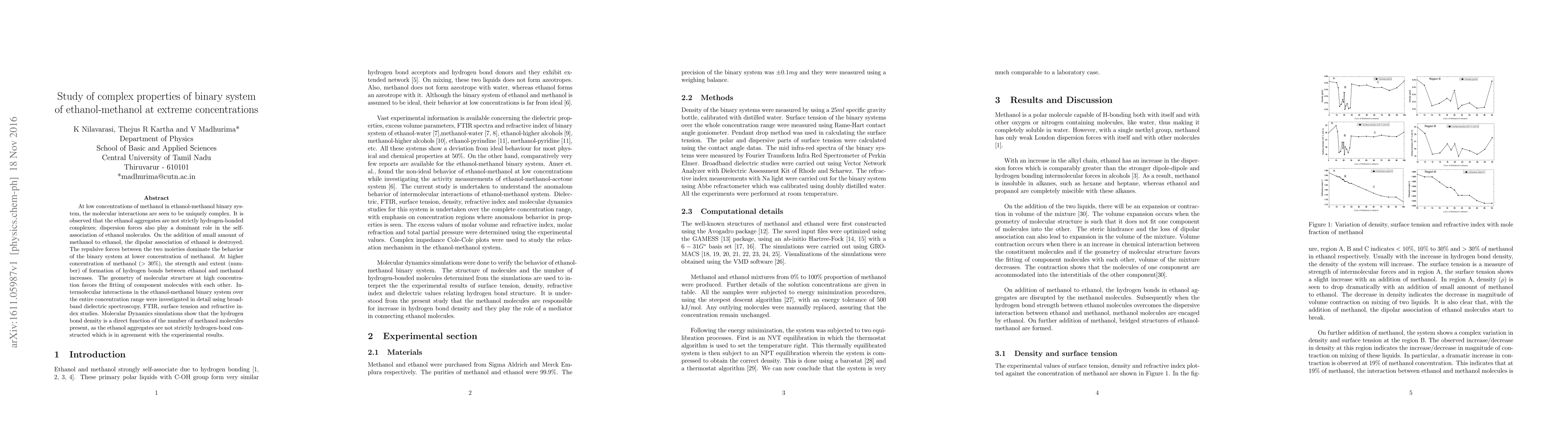 At low concentrations of methanol in ethanol-methanol binary system, the molecular interactions are seen to be uniquely complex. It is observed that the ethanol aggregates are not strictly hydrogen-bonded complexes; dispersion forces also play a dominant role in the self- association of ethanol molecules. On the addition of small amount of methanol to ethanol, the dipolar association of ethanol is destroyed. The repulsive forces between the two moieties dominate the behavior of the binary system at lower concentration of methanol. At higher concentration of methanol (> 30%), the strength and extent (number) of formation of hydrogen bonds between ethanol and methanol increases. The geometry of molecular structure at high concentration favors the fitting of component molecules with each other. Intermolecular interactions in the ethanol-methanol binary system over the entire concentration range were investigated in detail using broadband dielectric spectroscopy, FTIR, surface tension and refractive index studies. Molecular Dynamics simulations show that the hydrogen bond density is a direct function of the number of methanol molecules present, as the ethanol aggregates are not strictly hydrogen-bond constructed which is in agreement with the experimental results.