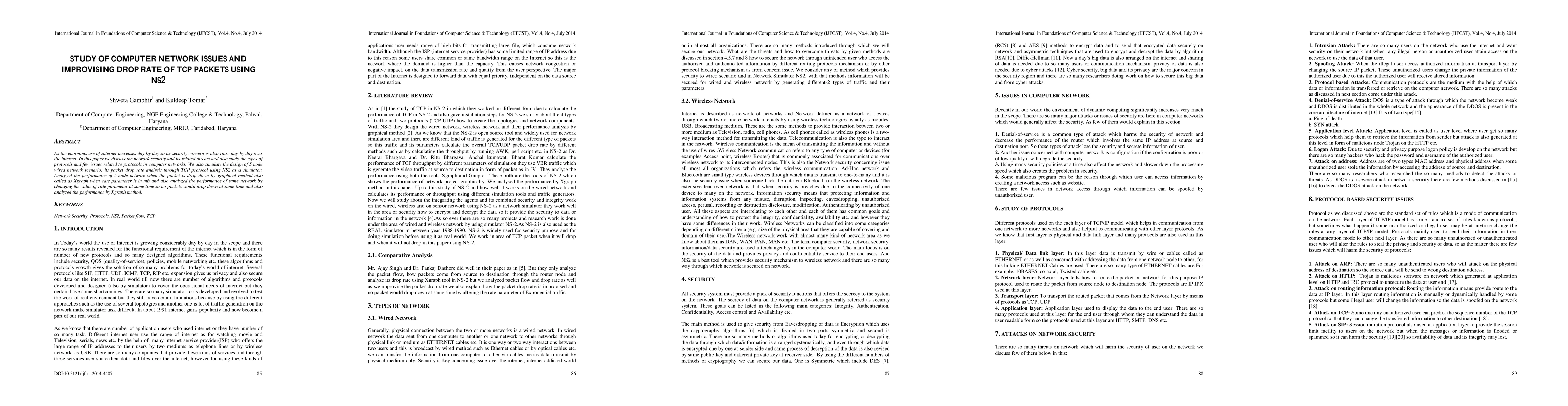 This paper investigates network security threats and examines issues related to TCP protocols in computer networks. It simulates a 5-node wired network using NS-2 to analyze TCP packet drop rates, employing graphical methods to assess performance under varying rate parameters to ensure no packet drops occur simultaneously.