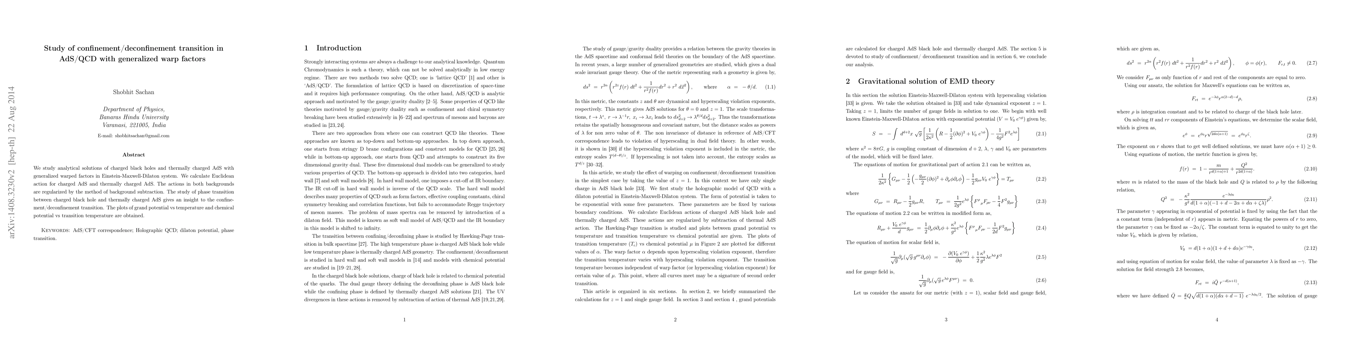 We study analytical solutions of charged black holes and thermally charged AdS with generalized warped factors in Einstein-Maxwell-Dilaton system. We calculate Euclidean action for charged AdS and thermally charged AdS. The actions in both backgrounds are regularized by the method of background subtraction. The study of phase transition between charged black hole and thermally charged AdS gives an insight to the confinement/deconfinement transition. The plots of grand potential vs temperature and chemical potential vs transition temperature are obtained.