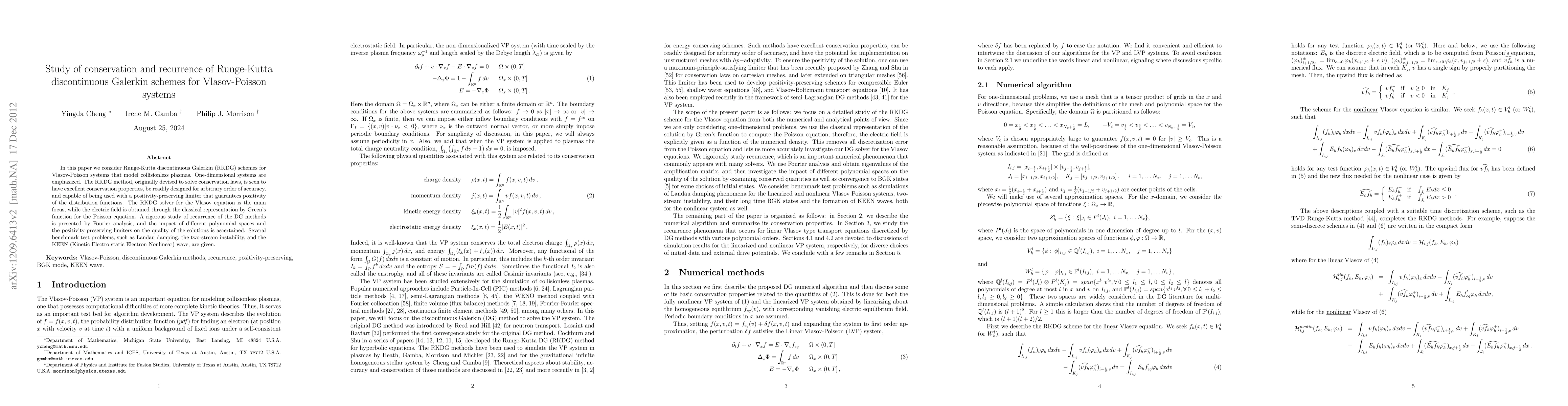 In this paper we consider Runge-Kutta discontinuous Galerkin (RKDG) schemes for Vlasov-Poisson systems that model collisionless plasmas. One-dimensional systems are emphasized. The RKDG method, originally devised to solve conservation laws, is seen to have excellent conservation properties, be readily designed for arbitrary order of accuracy, and capable of being used with a positivity-preserving limiter that guarantees positivity of the distribution functions. The RKDG solver for the Vlasov equation is the main focus, while the electric field is obtained through the classical representation by Green's function for the Poisson equation. A rigorous study of recurrence of the DG methods is presented by Fourier analysis, and the impact of different polynomial spaces and the positivity-preserving limiters on the quality of the solutions is ascertained. Several benchmark test problems, such as Landau damping, two-stream instability and the KEEN (Kinetic Electrostatic Electron Nonlinear) wave, are given.