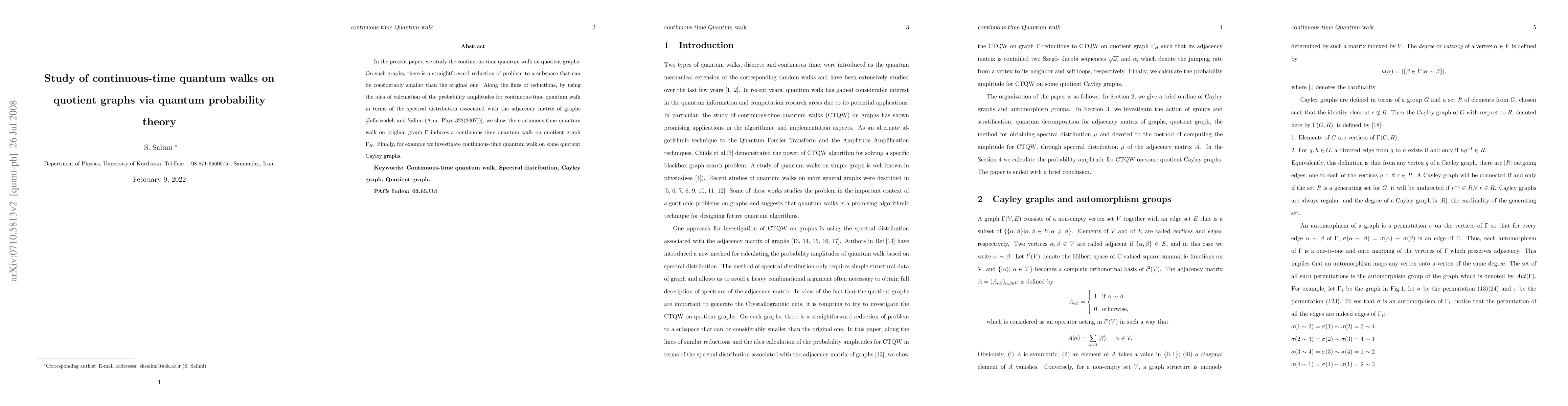 This paper investigates continuous-time quantum walks on quotient graphs, demonstrating how these walks can be reduced to smaller subspaces. It uses quantum probability theory to show that the continuous-time quantum walk on an original graph induces a corresponding walk on its quotient graph, exemplified through specific quotient Cayley graphs.