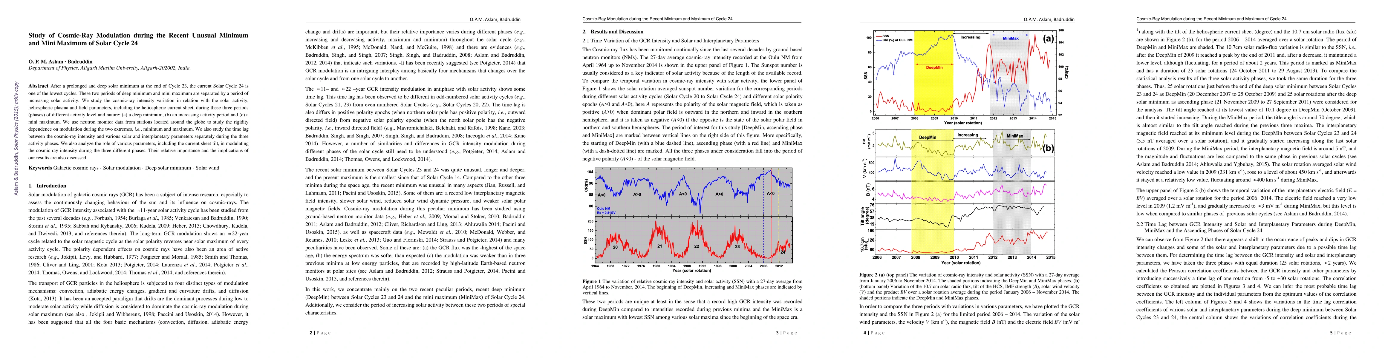 This study investigates cosmic-ray modulation during Solar Cycle 24's deep minimum, increasing activity period, and mini maximum. It analyzes cosmic-ray intensity variations in relation to solar activity and heliospheric parameters, using global neutron monitor data to explore rigidity dependence and time lags between cosmic-ray intensity and solar/interplanetary factors.