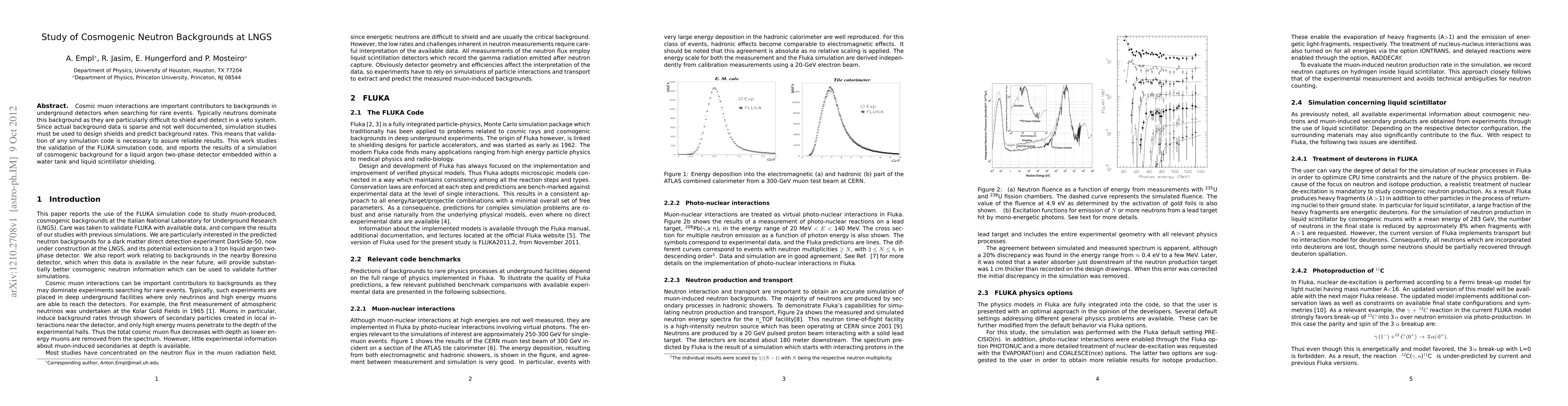 Cosmic muon interactions are important contributors to backgrounds in underground detectors when searching for rare events. Typically neutrons dominate this background as they are particularly difficult to shield and detect in a veto system. Since actual background data is sparse and not well documented, simulation studies must be used to design shields and predict background rates. This means that validation of any simulation code is necessary to assure reliable results. This work studies the validation of the FLUKA simulation code, and reports the results of a simulation of cosmogenic background for a liquid argon two-phase detector embedded within a water tank and liquid scintillator shielding.