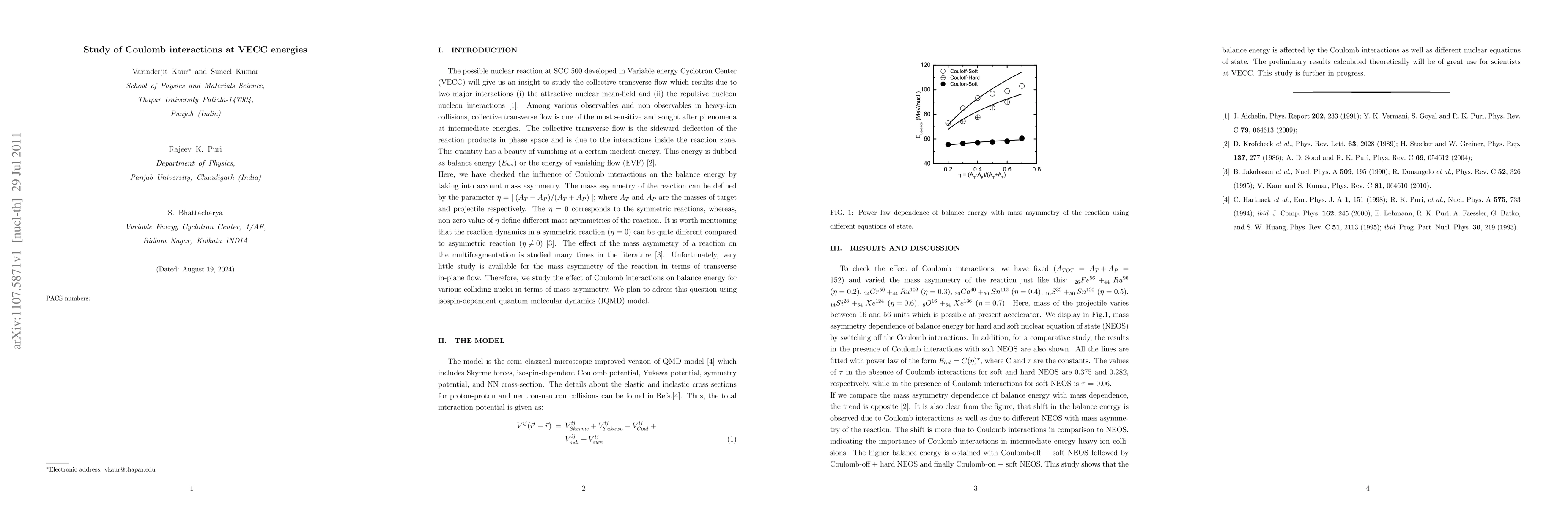 we study the effect of Coulomb interactions on balance energy for various colliding nuclei in terms of mass asymmetry. This study shows that the balance energy is affected by the Coulomb interactions as well as different nuclear equations of state. The preliminary results calculated theoretically will be of great use for scientists at VECC. This study is further in progress.