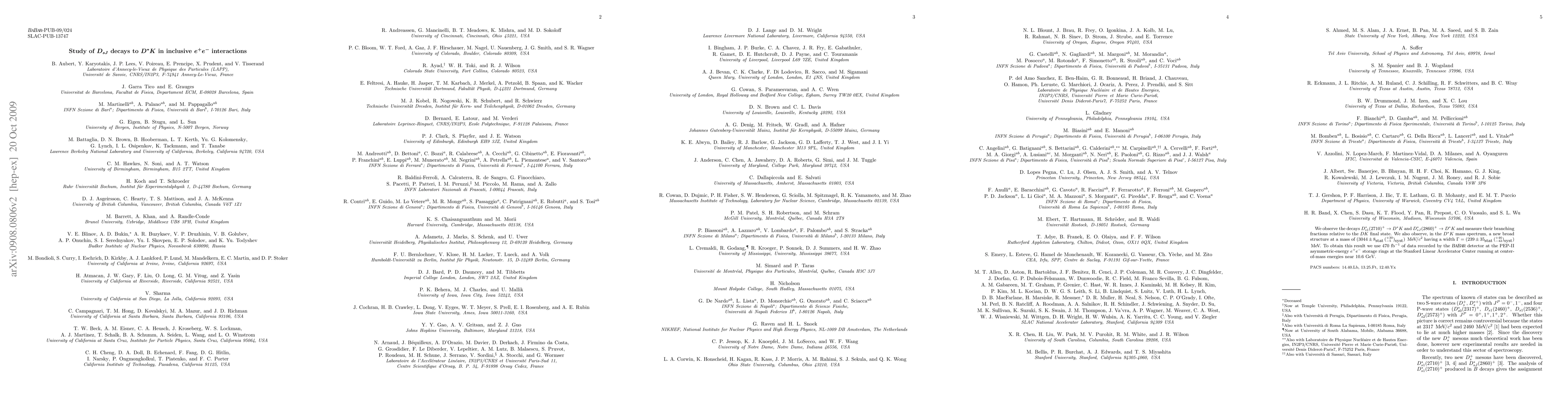 We observe the decays $ $D^*_{s1}(2710)^+ \to D^*K$ and $D^*_{sJ}(2860)^+ \to D^*K$ and measure their branching fractions relative to the $D K$ final state. We also observe, in the $D^*K$ mass spectrum, a new broad structure at a mass of $(3044 \pm 8_{stat} (^{+30}_{-5})_{syst})$ $MeV/c^2$ having a width $\Gamma=(239 \pm 35_{stat} (^{+46}_{-42})_{syst})$ $MeV$. To obtain this result we use 470 ${\rm fb}^{-1}$ of data recorded by the BaBar detector at the PEPII asymmetric-energy $e^+e^-$ storage rings at the Stanford Linear Accelerator Center running at center-of-mass energies near 10.6 GeV.