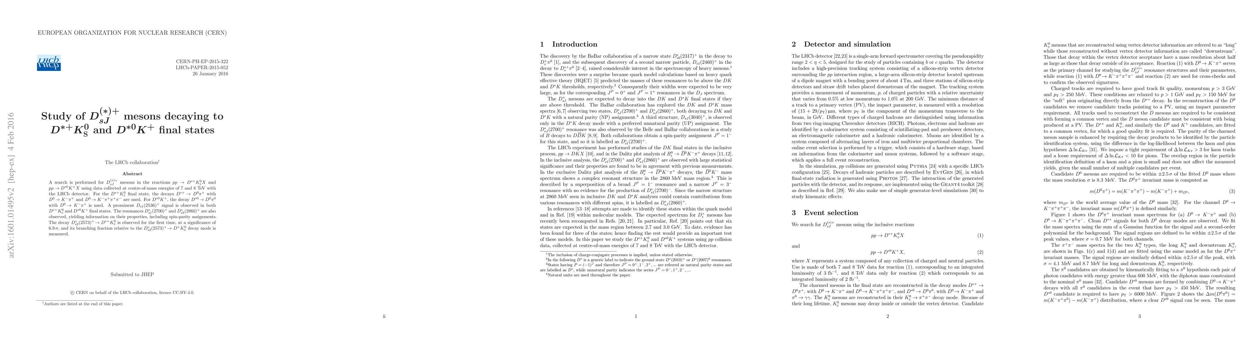 A search is performed for $D^{(*)+}_{sJ}$ mesons in the reactions $pp \to D^{*+} K^0_{\rm S} X$ and $pp \to D^{*0} K^+ X$ using data collected at centre-of-mass energies of 7 and 8 TeV with the LHCb detector. For the $D^{*+} K^0_{\rm S}$ final state, the decays $D^{*+} \to D^0 \pi^+$ with $D^0 \to K^- \pi^+$ and $D^0 \to K^- \pi^+ \pi^+ \pi^-$ are used. For $D^{*0} K^+$, the decay $D^{*0} \to D^0 \pi^0$ with $D^0 \to K^- \pi^+$ is used. A prominent $D_{s1}(2536)^+$ signal is observed in both $D^{*+} K^0_{\rm S}$ and $D^{*0} K^+$ final states. The resonances $D^*_{s1}(2700)^+$ and $D^*_{s3}(2860)^+$ are also observed, yielding information on their properties, including spin-parity assignments. The decay $D^*_{s2}(2573)^+ \to D^{*+} K^0_{\rm S}$ is observed for the first time, at a significance of 6.9 $\sigma$, and its branching fraction relative to the $D^*_{s2}(2573)^+ \to D^+ K^0_{\rm S}$ decay mode is measured.