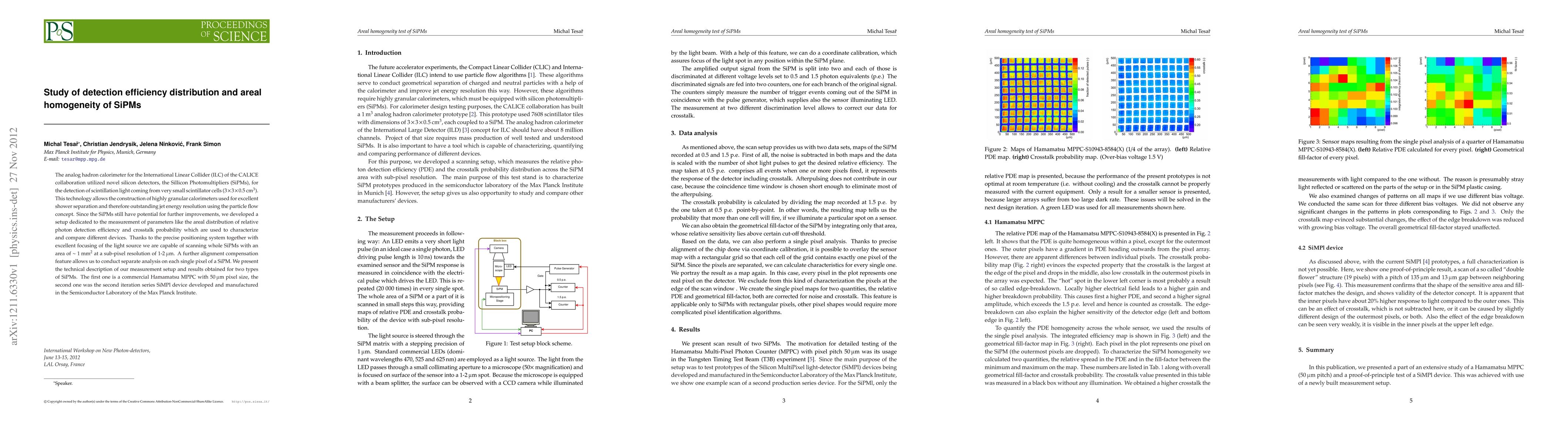 Researchers studied the detection efficiency distribution and areal homogeneity of Silicon Photomultipliers (SiPMs) used in a calorimeter for the International Linear Collider, finding potential improvements through analysis of two SiPM types.