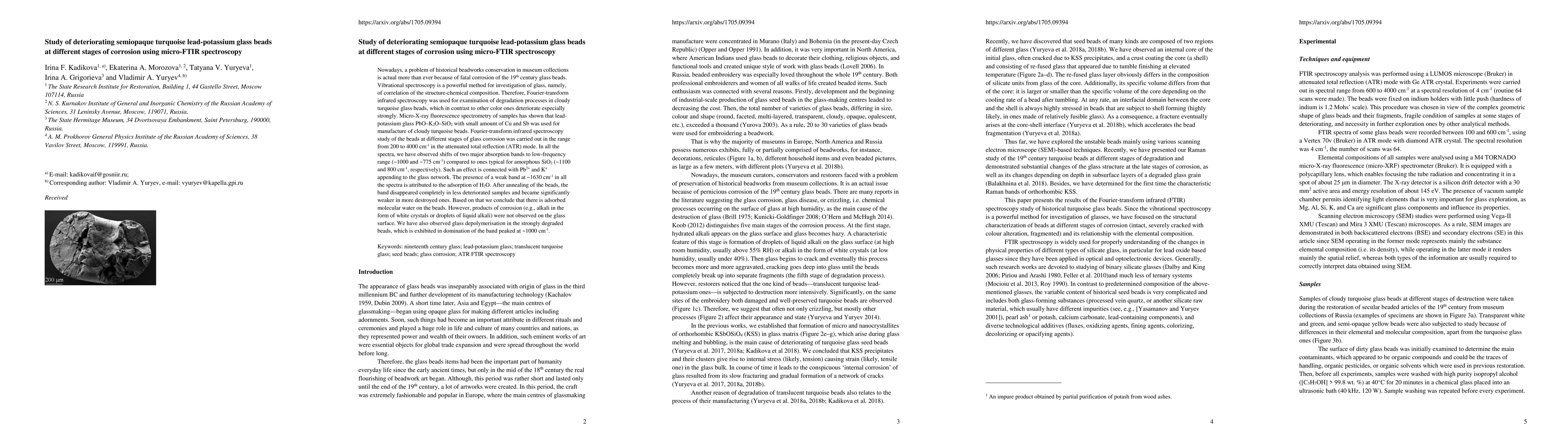 Nowadays, a problem of historical beadworks conservation in museum collections is actual more than ever because of fatal corrosion of the 19th century glass beads. Vibrational spectroscopy is a powerful method for investigation of glass, namely, of correlation of the structure-chemical composition. Therefore, Fourier-transform infrared spectroscopy was used for examination of degradation processes in cloudy turquoise glass beads, which in contrast to other color ones deteriorate especially strongly. Micro-X-ray fluorescence spectrometry of samples has shown that lead-potassium glass PbO-K$_2$O-SiO$_2$ with small amount of Cu and Sb was used for manufacture of cloudy turquoise beads. Fourier-transform infrared spectroscopy study of the beads at different stages of glass corrosion was carried out in the range from 200 to 4000 cm$^{-1}$ in the attenuated total reflection mode. In all the spectra, we have observed shifts of two major absorption bands to low-frequency range (~1000 and ~775 cm$^{-1}$) compared to ones typical for amorphous SiO2 (~1100 and 800 cm$^{-1}$, respectively). Such an effect is connected with Pb$^{2+}$ and K$^+$ appending to the glass network. The presence of a weak band at ~1630 cm$^{-1}$ in all the spectra is attributed to the adsorption of H$_2$O. After annealing of the beads, the band disappeared completely in less deteriorated samples and became significantly weaker in more destroyed ones. Based on that we conclude that there is adsorbed molecular water on the beads. However, products of corrosion (e.g., alkali in the form of white crystals or droplets of liquid alkali) were not observed on the glass surface. We have also observed glass depolymerisation in the strongly degraded beads, which is exhibited in domination of the band peaked at ~1000 cm$^{-1}$.
