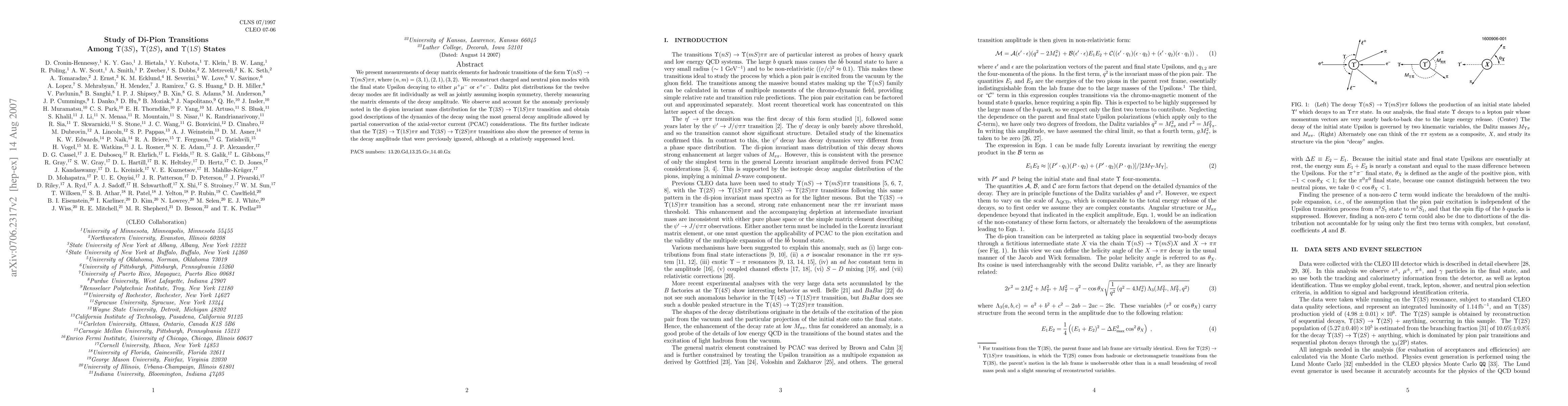 This study measures decay matrix elements for di-pion transitions among Upsilon states, observing anomalies in the Upsilon(3S) -> pi pi Upsilon(1S) decay and identifying previously ignored terms in other transitions, using Dalitz plot fits and PCAC considerations.