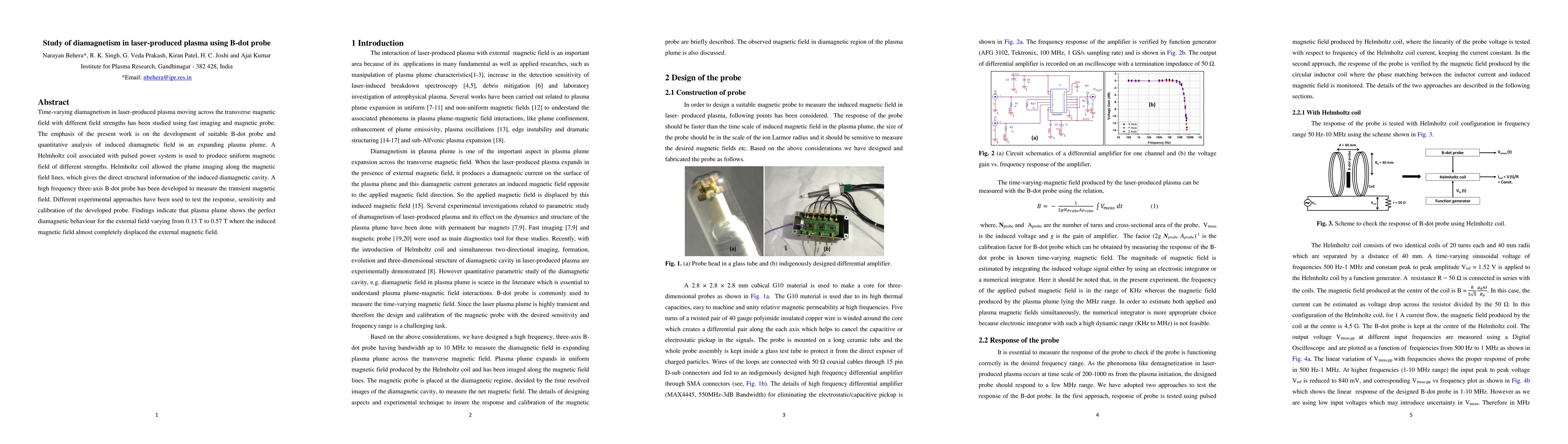 Time-varying diamagnetism in laser-produced plasma moving across the transverse magnetic field with different field strengths has been studied using fast imaging and magnetic probe. The emphasis of the present work is on the development of suitable B-dot probe and quantitative analysis of induced diamagnetic field in an expanding plasma plume. A Helmholtz coil associated with pulsed power system is used to produce uniform magnetic field of different strengths. Helmholtz coil allowed the plume imaging along the magnetic field lines, which gives the direct structural information of the induced diamagnetic cavity. A high frequency three-axis B-dot probe has been developed to measure the transient magnetic field. Different experimental approaches have been used to test the response, sensitivity and calibration of the developed probe. Findings indicate that plasma plume shows the perfect diamagnetic behaviour for the external field varying from 0.13 T to 0.57 T where the induced magnetic field almost completely displaced the external magnetic field.