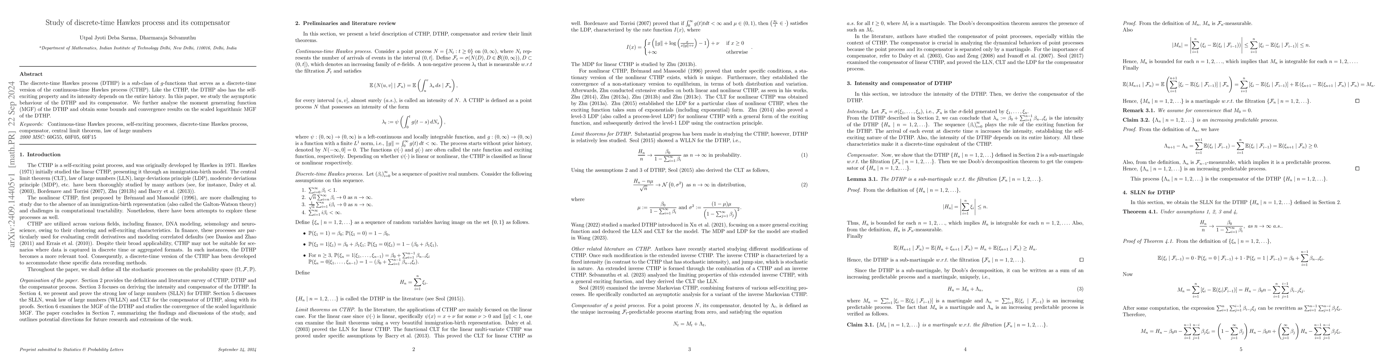 This paper investigates the asymptotic behavior and moment generating function of the discrete-time Hawkes process (DTHP), providing bounds and convergence results on the scaled logarithmic moment generating function, along with a detailed analysis of its compensator.