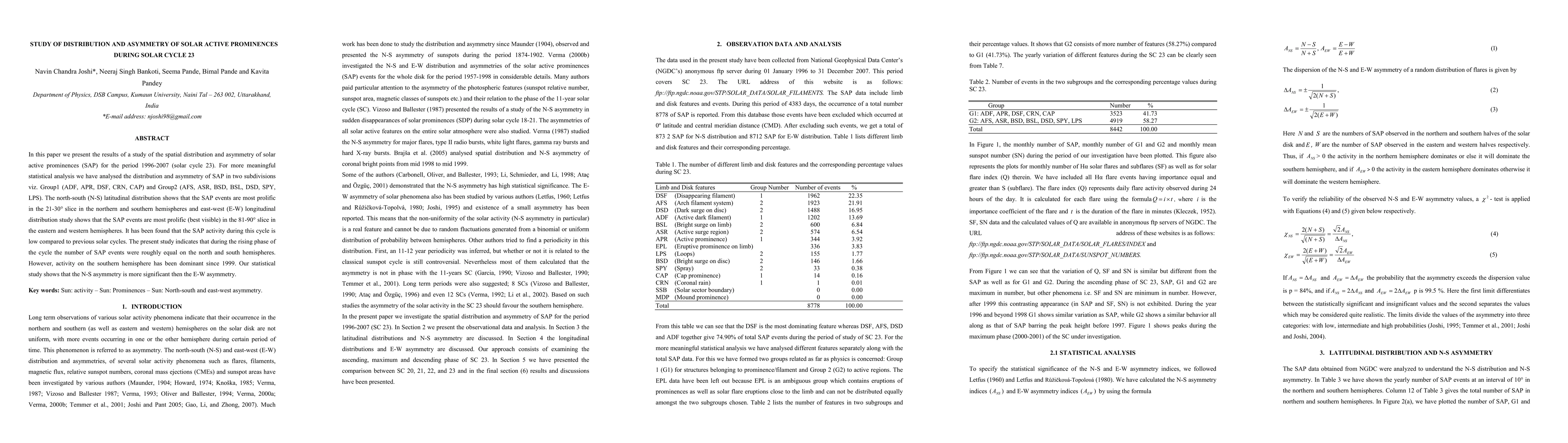 This study examines the spatial distribution and asymmetry of solar active prominences (SAP) during solar cycle 23 (1996-2007), revealing a higher concentration in the 21-30° latitudinal and 81-90° longitudinal slices. The analysis shows lower SAP activity compared to previous cycles, with a notable dominance of southern hemisphere activity since 1999, indicating greater north-south asymmetry than east-west asymmetry.