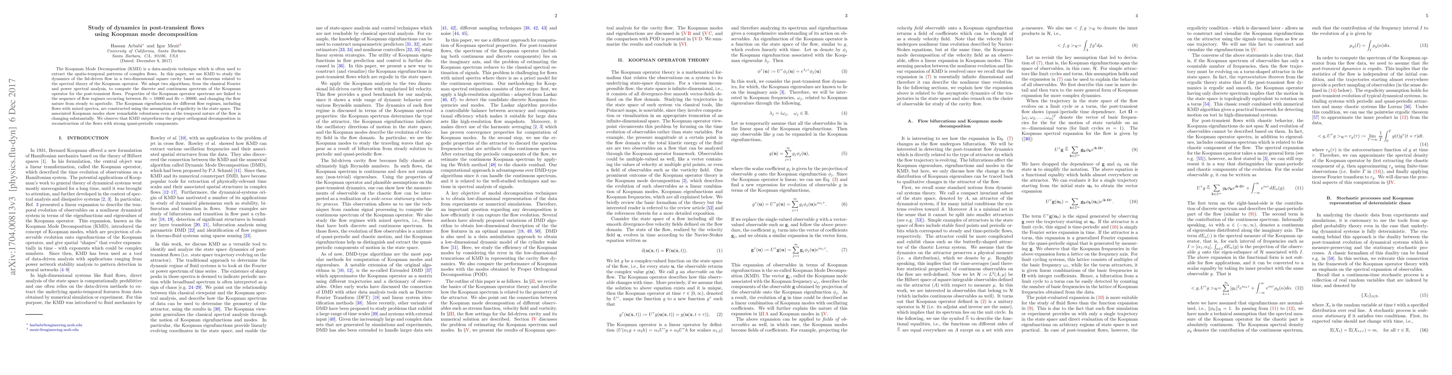 The Koopman Mode Decomposition (KMD) is a data-analysis technique which is often used to extract the spatio-temporal patterns of complex flows. In this paper, we use KMD to study the dynamics of the lid-driven flow in a two-dimensional square cavity based on theorems related to the spectral theory of the Koopman operator. We adapt two algorithms, from the classical Fourier and power spectral analysis, to compute the discrete and continuous spectrum of the Koopman operator for the post-transient flows. Properties of the Koopman operator spectrum are linked to the sequence of flow regimes occurring between $Re=10000$ and $Re=30000$, and changing the flow nature from steady to aperiodic. The Koopman eigenfunctions for different flow regimes, including flows with mixed spectra, are constructed using the assumption of ergodicity in the state space. The associated Koopman modes show remarkable robustness even as the temporal nature of the flow is changing substantially. We observe that KMD outperforms the Proper Orthogonal Decomposition in reconstruction of the flows with strong quasi-periodic components.c features are present in the flow.
