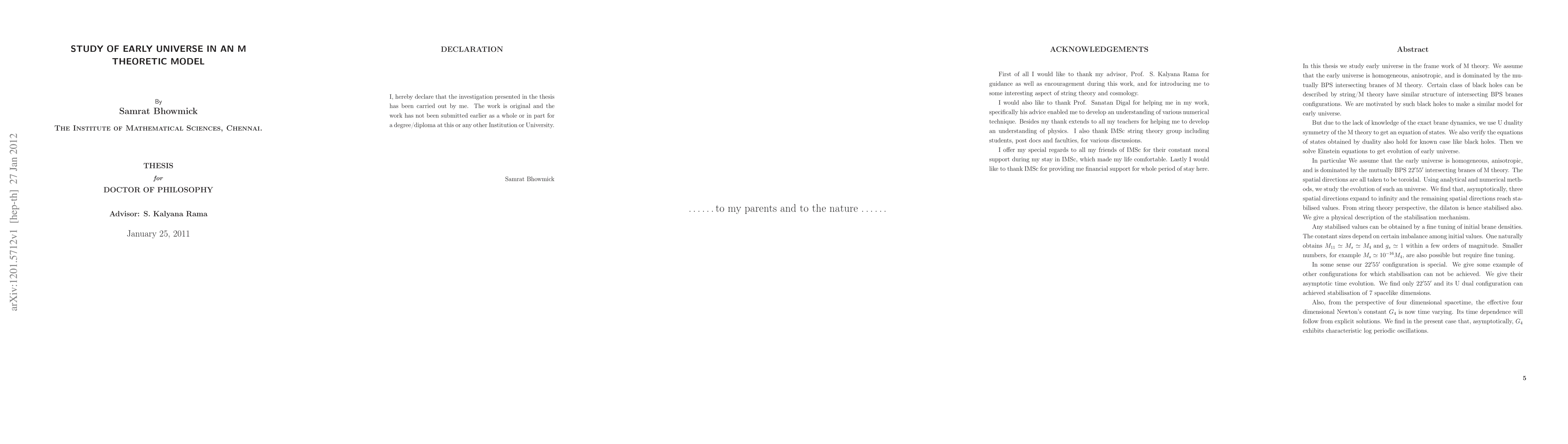 In this thesis we study early universe in the frame work of M theory. In particular We assume that the early universe is homogeneous, anisotropic, and is dominated by the mutually BPS 22'55' intersecting branes of M theory. We find that, asymptotically, three spatial directions expand to infinity and the remaining spatial directions reach stabilised values. We give a physical description of the stabilisation mechanism.