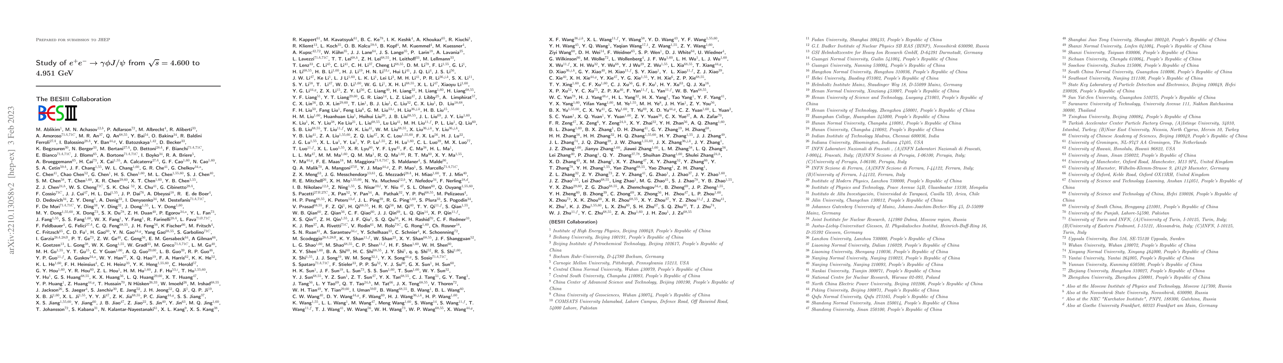 The BESIII experiment investigates the $e^+e^-\to\gamma\phi J/\psi$ process over a range from 4.600 to 4.951 GeV, observing the $e^+e^-\to\phi\chi_{c1,c2}$ processes with significant evidence and identifying a resonance structure in $\phi\chi_{c2}$. No clear structures are found for $e^+e^-\to\gamma X(4140)$, $\gamma X(4274)$, and $\gamma X(4500)$ processes.