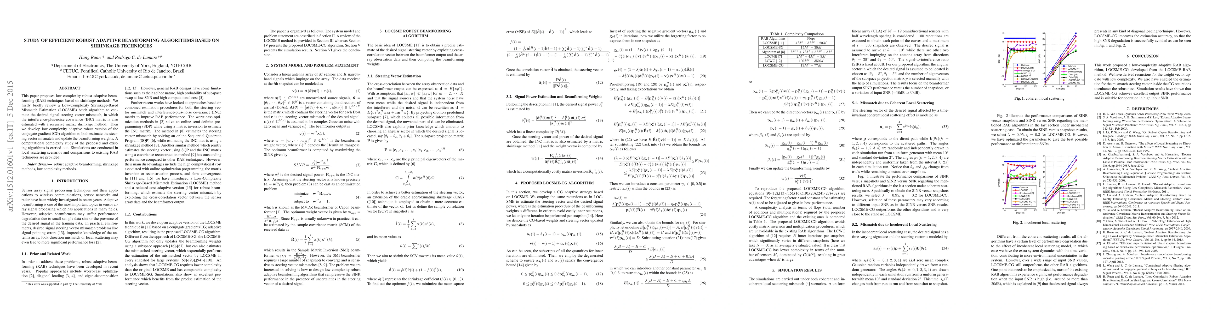 This paper proposes low-complexity robust adaptive beamforming algorithms based on shrinkage techniques, including a LOCSME batch algorithm and an adaptive robust conjugate gradient method, and compares their computational efficiency with existing methods through simulations.