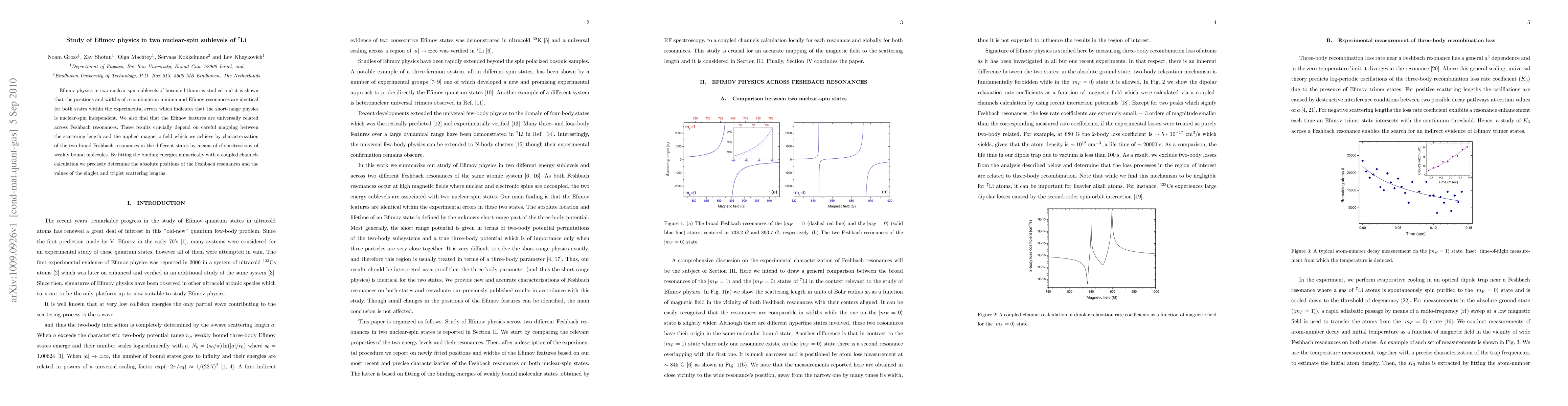 This study investigates Efimov physics in two nuclear-spin sublevels of 7Li, revealing identical recombination minima and Efimov resonance positions within experimental errors, indicating nuclear-spin independence. The universal relation of Efimov features across Feshbach resonances is confirmed through precise mapping of scattering lengths and magnetic fields using rf-spectroscopy and coupled channels calculations.