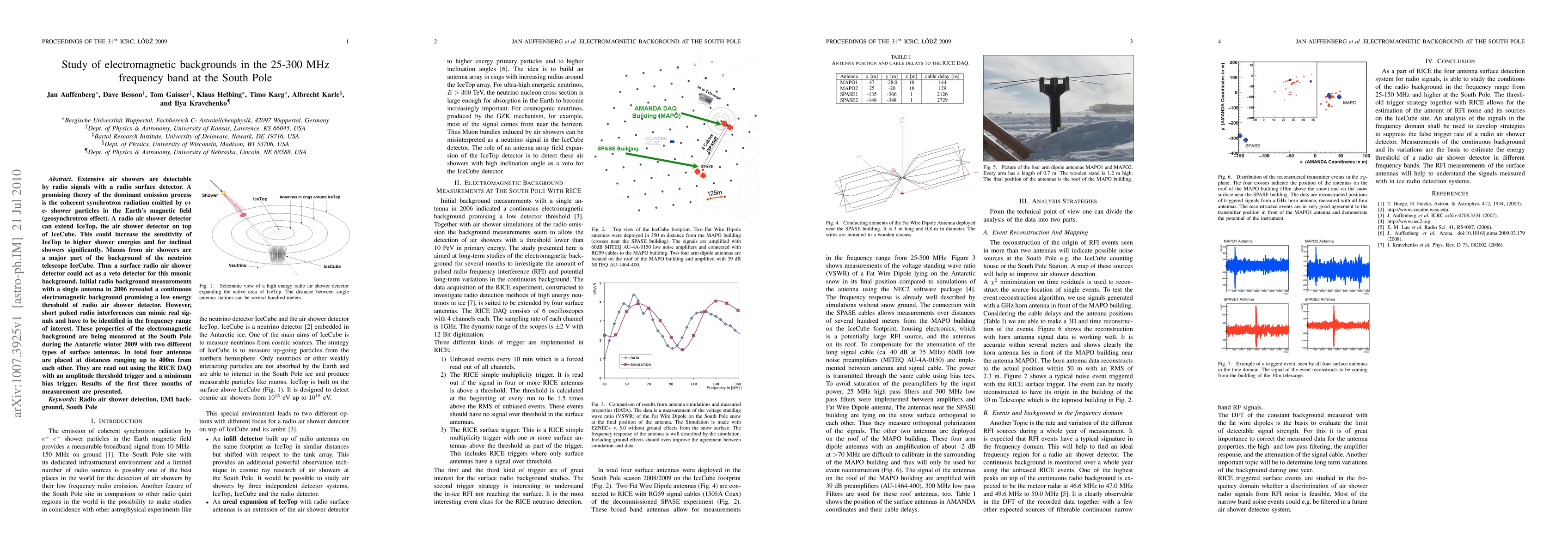 This study investigates electromagnetic backgrounds in the 25-300 MHz frequency band at the South Pole to detect radio signals from extensive air showers. The research aims to utilize coherent synchrotron radiation for improved air shower detection and to reduce muonic background for the IceCube neutrino telescope.