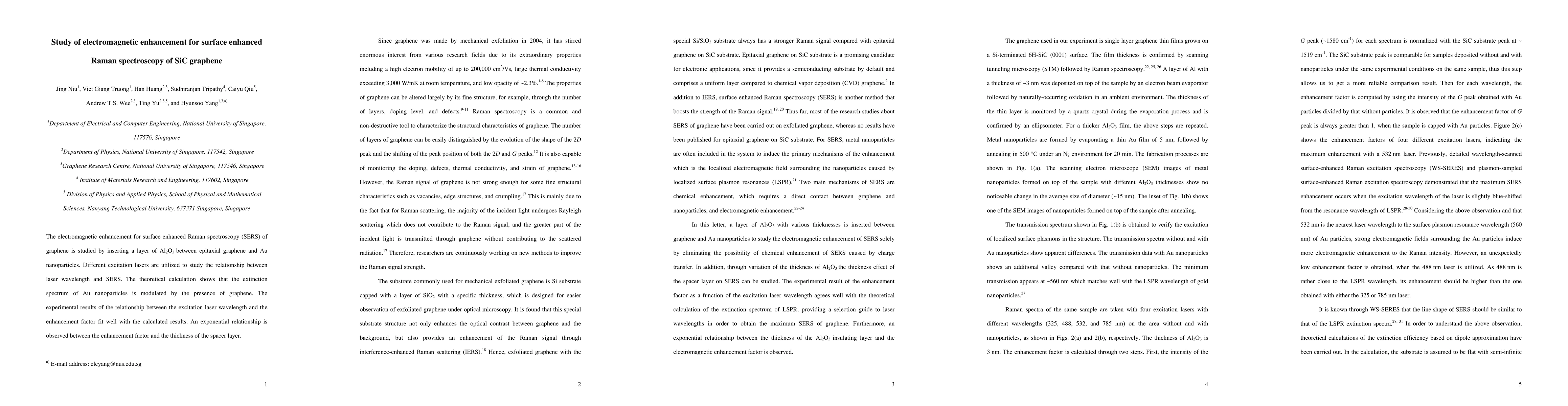 This paper investigates the electromagnetic enhancement in SERS for graphene using Al2O3 as a spacer between graphene and Au nanoparticles. Theoretical and experimental results show that the laser wavelength affects the enhancement factor, with an exponential relationship observed between the enhancement factor and the spacer layer thickness.
