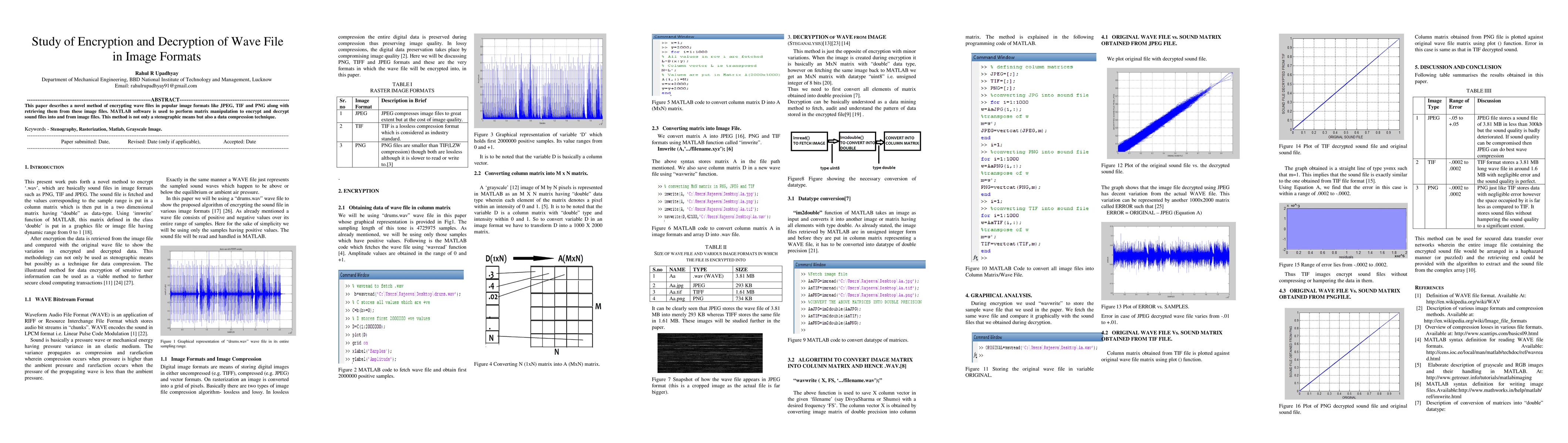 This paper describes a novel method of encrypting wave files in popular image formats like JPEG, TIF and PNG along with retrieving them from these image files. MATLAB software is used to perform matrix manipulation to encrypt and decrypt sound files into and from image files. This method is not only a stenographic means but also a data compression technique.