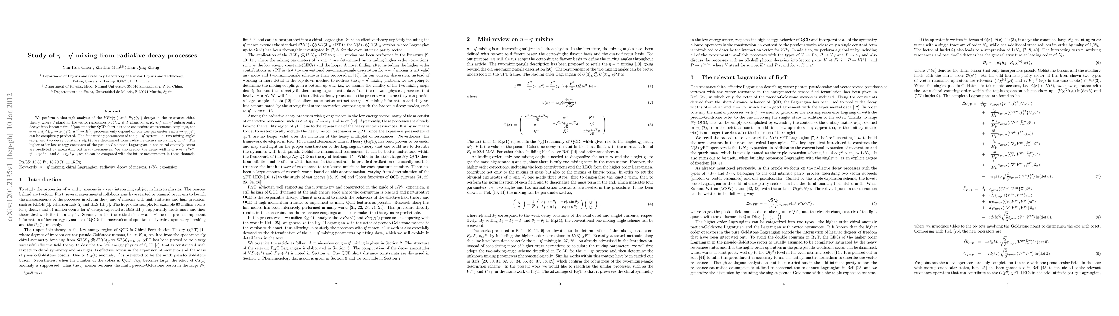 This study analyzes VPγ and Pγγ decays within resonance chiral theory to determine η-η' mixing parameters using QCD constraints. The analysis reveals that several decay processes can be predicted, leading to determinations of the η-η' mixing angles and decay constants, and predictions for decay widths of specific meson decays.