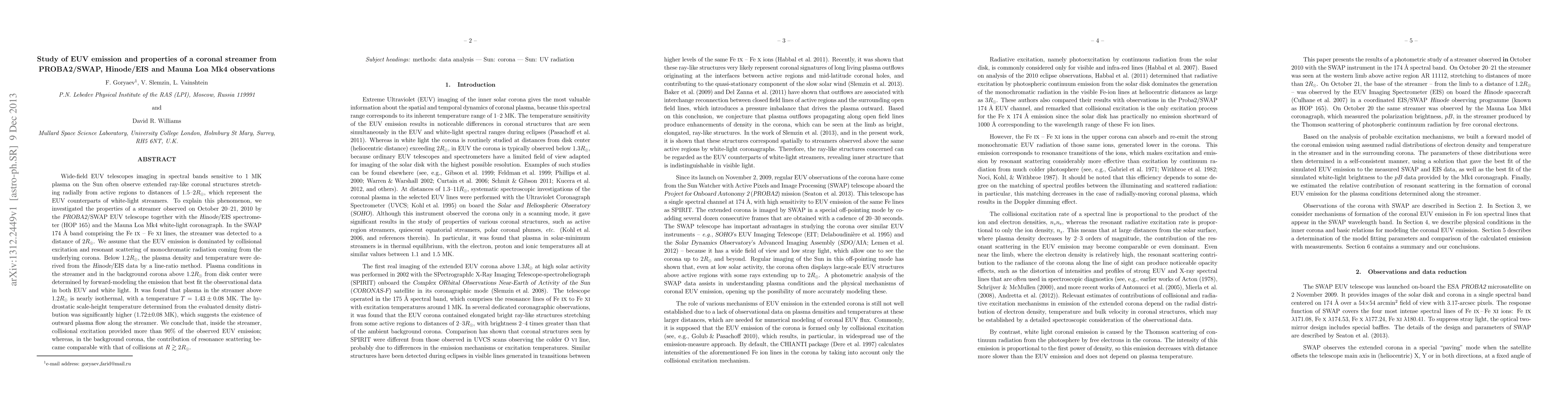 This study investigates the properties of a coronal streamer observed in EUV by PROBA2/SWAP and in white light by Mauna Loa Mk4, using Hinode/EIS data. The streamer's plasma above 1.2Rsun is nearly isothermal at 1.43±0.08 MK, with a higher hydrostatic temperature suggesting outward plasma flow, and collisional excitation dominates the EUV emission.