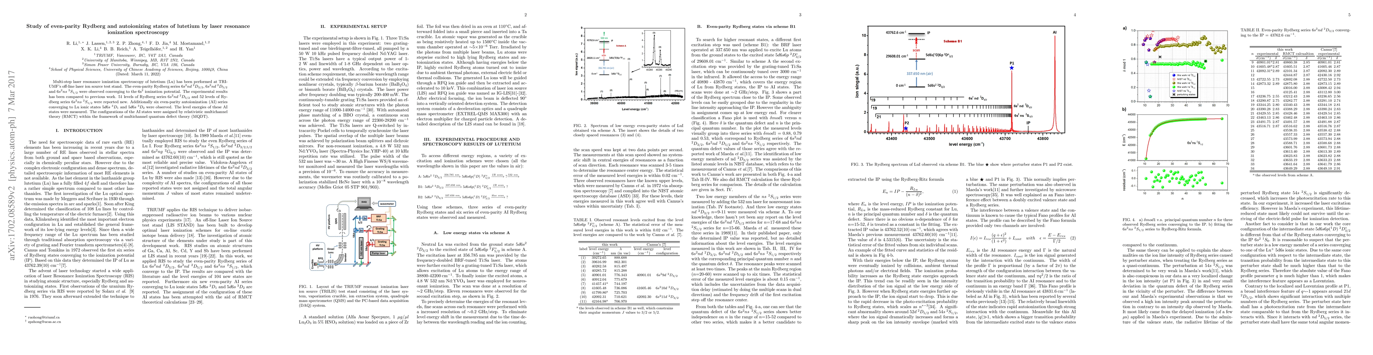 Multi-step laser resonance ionization spectroscopy of lutetium (Lu) has been performed at TRIUMF's off-line laser ion source test stand. The even-parity Rydberg series $6s^2nd$ $^2D_{3/2}$, $6s^2nd$ $^2D_{5/2}$ and $6s^2ns$ $^2S_{1/2}$ were observed converging to the 6s$^2$ ionization potential. The experimental results has been compared to previous work. 51 levels of Rydberg series $6s^2nd$ $^2D_{5/2}$ and 52 levels of Rydberg series $6s^2ns$ $^2S_{1/2}$ were reported new. Additionally six even-parity autoionization (AI) series converging to Lu ionic states $5d6s$ $^3D_1$ and $5d6s$ $^3D_2$ were observed. The level energies of these AI states were measured. The configurations of the AI states were assigned by relativistic multichannel theory (RMCT) within the framework of multichannel quantum defect theory (MQDT).