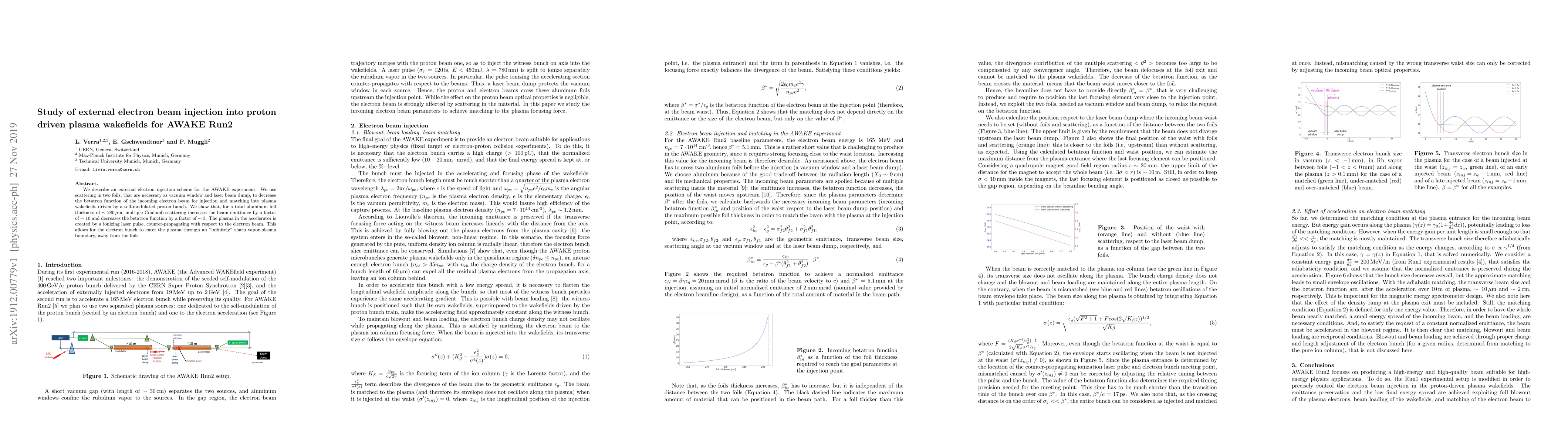 This study details an external electron injection method for the AWAKE experiment, utilizing scattering in two foils to match the electron beam's properties for plasma wakefield interaction with a proton-driven plasma. The foils increase the beam emittance by a factor of 10 but decrease the betatron function by a factor of 3, enabling precise entry into the plasma.