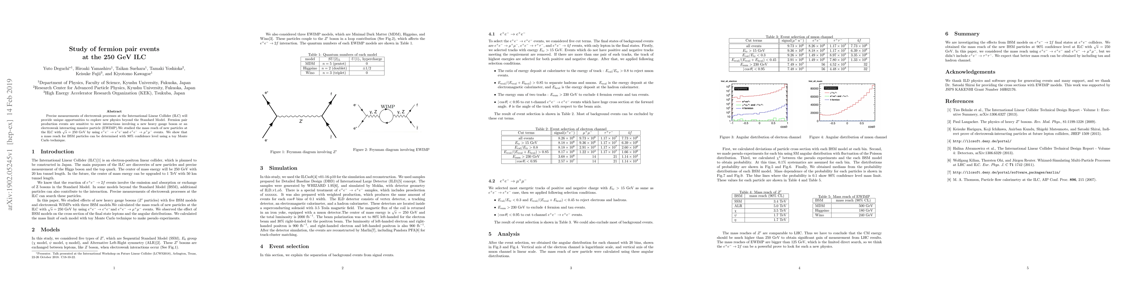 Precise measurements of electroweak processes at the International Linear Collider (ILC) will provide unique opportunities to explore new physics beyond the Standard Model. Fermion pair production events are sensitive to new interactions involving a new heavy gauge boson or an electroweak interacting massive particle (EWIMP).We studied the mass reach of new particles at the ILC with $\sqrt{s}=250$ GeV by using $e^+ e^-\to e^+ e^-$and $e^+ e^-\to \mu^+ \mu^-$ events. We show that a mass reach for BSM particles can be determined with 90% confidence level using a toy Monte Carlo technique.