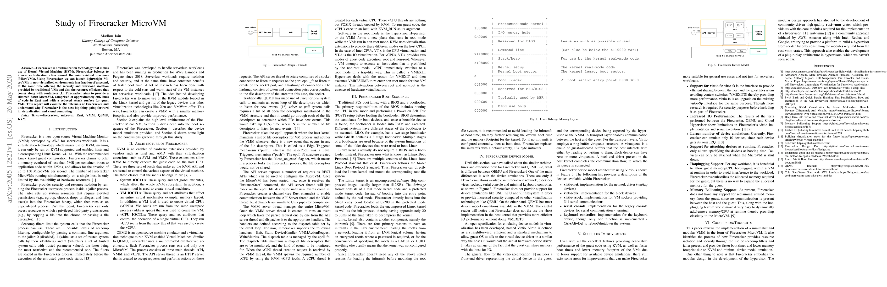 Firecracker is a virtualization technology that makes use of Kernel Virtual Machine (KVM). Firecracker belongs to a new virtualization class named the micro-virtual machines (MicroVMs). Using Firecracker, we can launch lightweight MicroVMs in non-virtualized environments in a fraction of a second, at the same time offering the security and workload isolation provided by traditional VMs and also the resource efficiency that comes along with containers \cite{b1}. Firecracker aims to provide a slimmed-down MicroVM, comprised of approximately 50K lines of code in Rust and with a reduced attack surface for guest VMs. This report will examine the internals of Firecracker and understand why Firecracker is the next big thing going forward in virtualization and cloud computing.