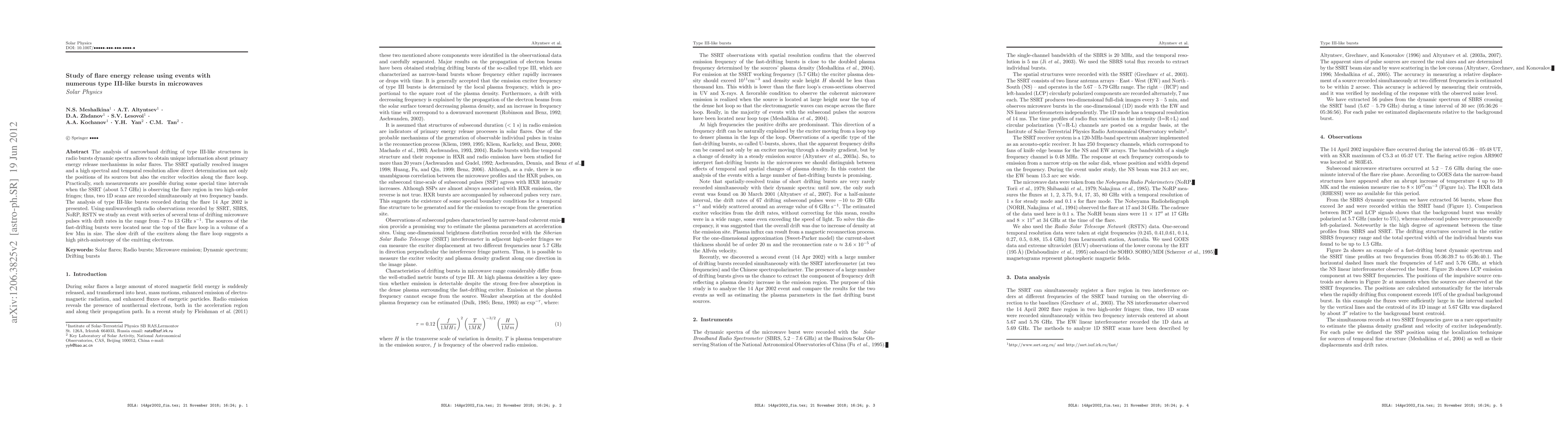 The analysis of narrowband drifting of type III-like structures in radio bursts dynamic spectra allows to obtain unique information about primary energy release mechanisms in solar flares. The SSRT spatially resolved images and a high spectral and temporal resolution allow direct determination not only the positions of its sources but also the exciter velocities along the flare loop. Practically, such measurements are possible during some special time intervals when the SSRT (about 5.7 GHz) is observing the flare region in two high-order fringes; thus, two 1D scans are recorded simultaneously at two frequency bands. The analysis of type III-like bursts recorded during the flare 14 Apr 2002 is presented. Using-muliwavelength radio observations recorded by SSRT, SBRS, NoRP, RSTN we study an event with series of several tens of drifting microwave pulses with drift rates in the range from -7 to 13 GHz/s. The sources of the fast-drifting bursts were located near the top of the flare loop in a volume of a few Mm in size. The slow drift of the exciters along the flare loop suggests a high pitch-anisotropy of the emitting electrons.
