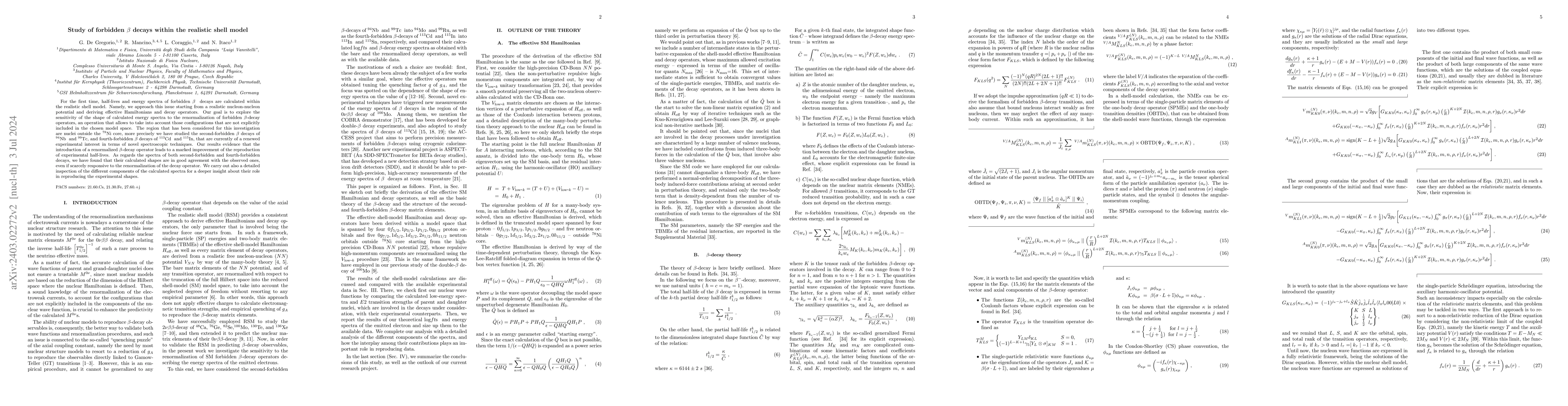 For the first time, half-lives and energy spectra of forbidden $\beta$ decays are calculated within the realistic shell model. Namely, we approach this issue starting from a realistic nucleon-nucleon potential and deriving effective Hamiltonians and decay operators. Our goal is to explore the sensitivity of the shape of calculated energy spectra to the renormalization of forbidden $\beta$ -decay operators, an operation that allows to take into account those configurations that are not explicitly included in the chosen model space. The region that has been considered for this investigation are nuclei outside the $^{78}$Ni core, more precisely we have studied the second-forbidden $\beta$ decays of $^{94}$Nb and $^{99}$Tc, and fourth-forbidden $\beta$ decays of $^{113}$Cd and $^{115}$In, that are currently of a renewed experimental interest in terms of novel spectroscopic techniques. Our results evidence that the introduction of a renormalized $\beta$-decay operator leads to a marked improvement of the reproduction of experimental half-lives. As regards the spectra of both second-forbidden and fourth-forbidden decays, we have found that their calculated shapes are in good agreement with the observed ones, even if scarcely responsive to the renormalization of the decay operator. We carry out also a detailed inspection of the different components of the calculated spectra for a deeper insight about their role in reproducing the experimental shapes.