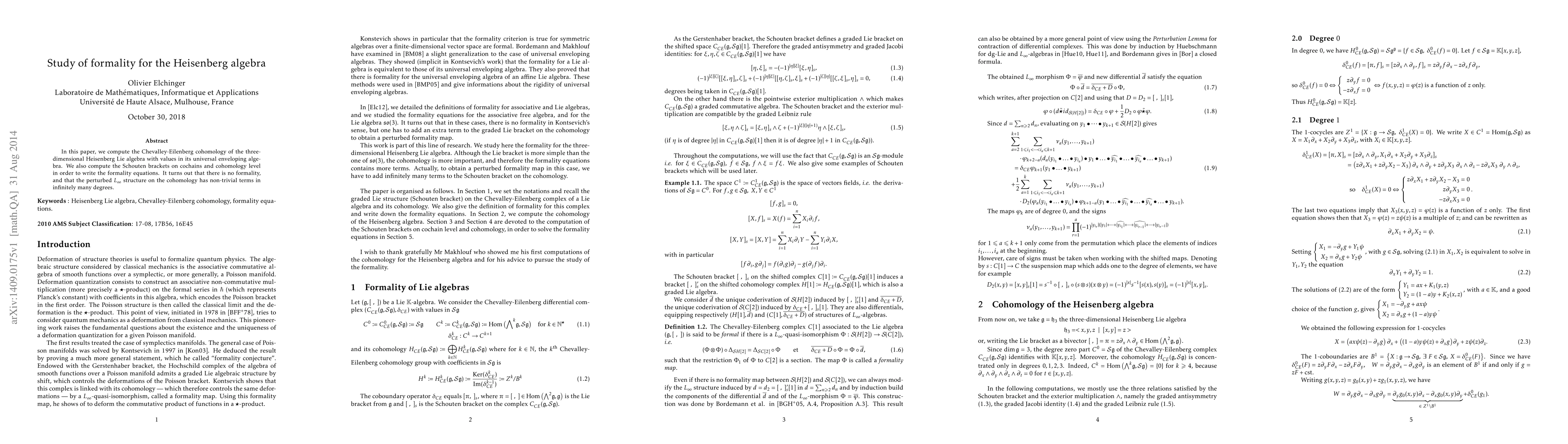 In this paper, we compute the Chevalley-Eilenberg cohomology of the three-dimensionnal Heisenberg Lie algebra with values in its universal enveloping algebra. We also compte the Schouten brackets on cochains and cohomology level in order to write the formality equations. It turns out that there is no formality, ans that the perturbed L-infinity structure on the cohomology has non-trivial terms in infinitely manu degrees.
